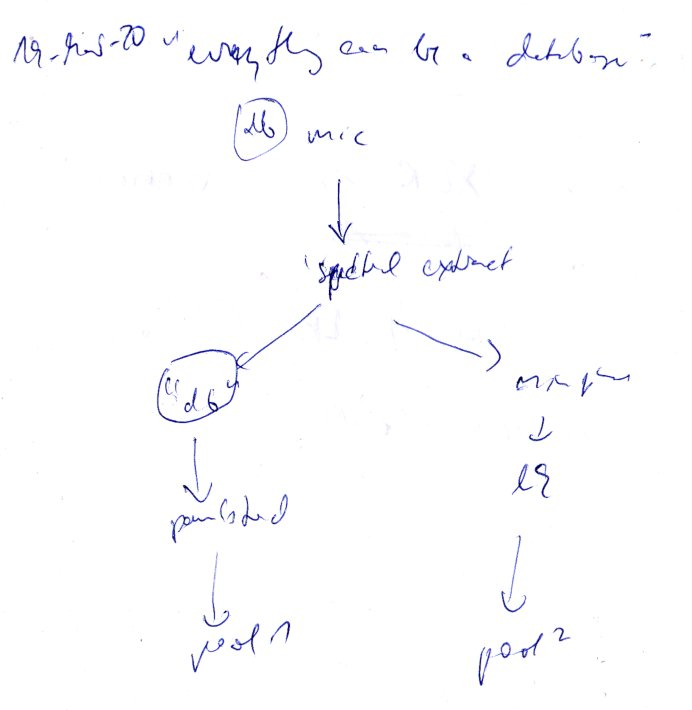 Perhaps there is not one database (from the microphone), but several, as intermediate processing results feed into different rendering processes. (For example the thresholding goes into the minimum-phase and lin-kernighan process, but also into the Paul stretch process).