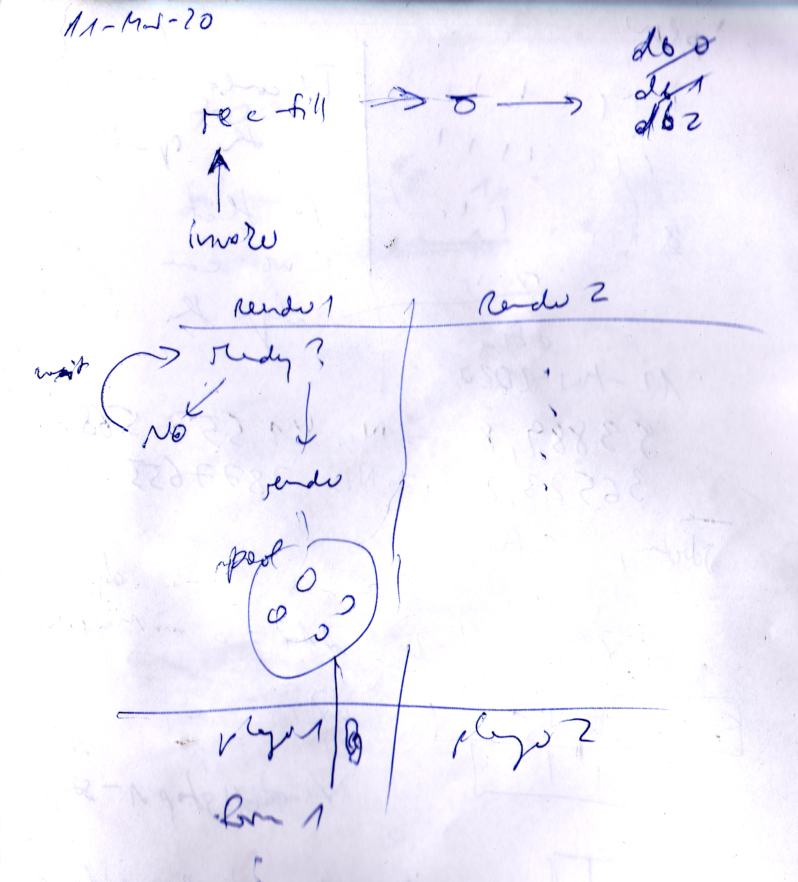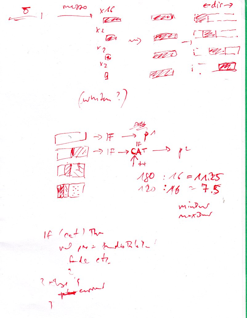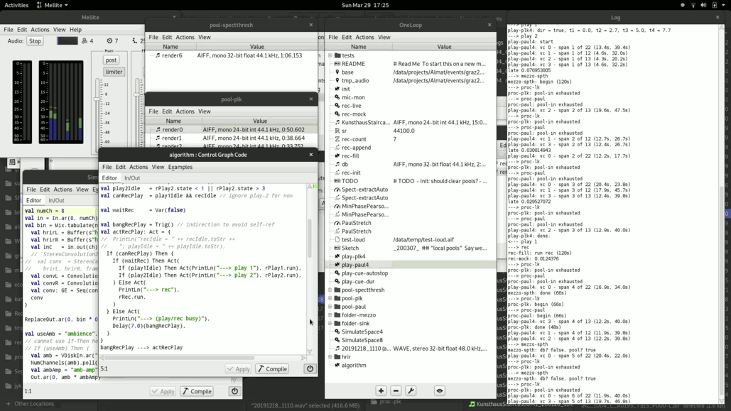 Logically, I am dividing the processes into three layers; one is real-time input gathering, one is rendering the various transformations and analyses, the third is real-time sound production. The idea is that they can run each on their own, just exchanging data. The input gathering thus recordings into sound files which are "filled up" as new material is needed (and available, given the planned "common listening" mode!). The rendering layer then takes the current "database" (input sound gathering) if it has sufficient length, and starts non-realtime rendering processes, the output of which form another pool of sounds. This pool is then used for the third layer.