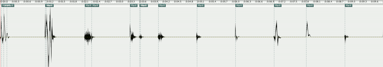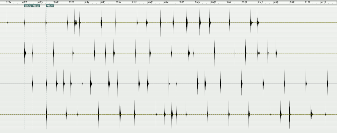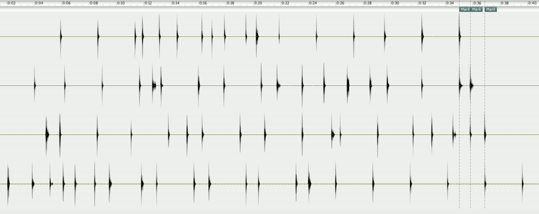 For the first process, the percussive resonant steps, I am now trying to see what happens if four channels are combined and "synchronised" in pairwise succession either at the beginning or at the end of the phrases.