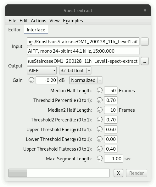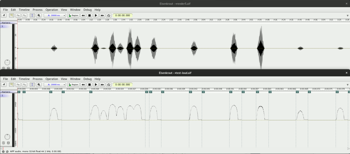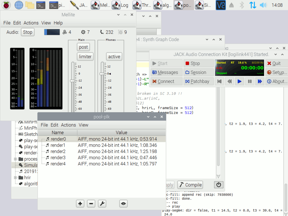 I spent some time debugging a "full" loop for capturing, rendering, playing, so that it works without problems, also on the Pi. The sound is thus still very simple, as I have only implemented on process, and also there is only few parameters which are modulated, so the gestures are quite similar. Still, I think it's a good beginning. (I still have to fix a bug where some analyses produce zero segments which locks up the renderer)