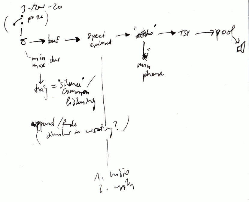 The first rendering process I am implementing is the one that is described on the left here: Applying energy / spectral flatness thresholds, transforming the thus filtered material into pure resonances (minimum phase spikes), and then ordering them using the complete graph of timbral similarities of the segments along with the Lin-Kernighan algorithm. Most of the work I am doing now, is seeing that this runs by itself, drawing input sounds from the microphone, doing the rendering into a pool, playing from the pool. I should be finished with this in the next few days.