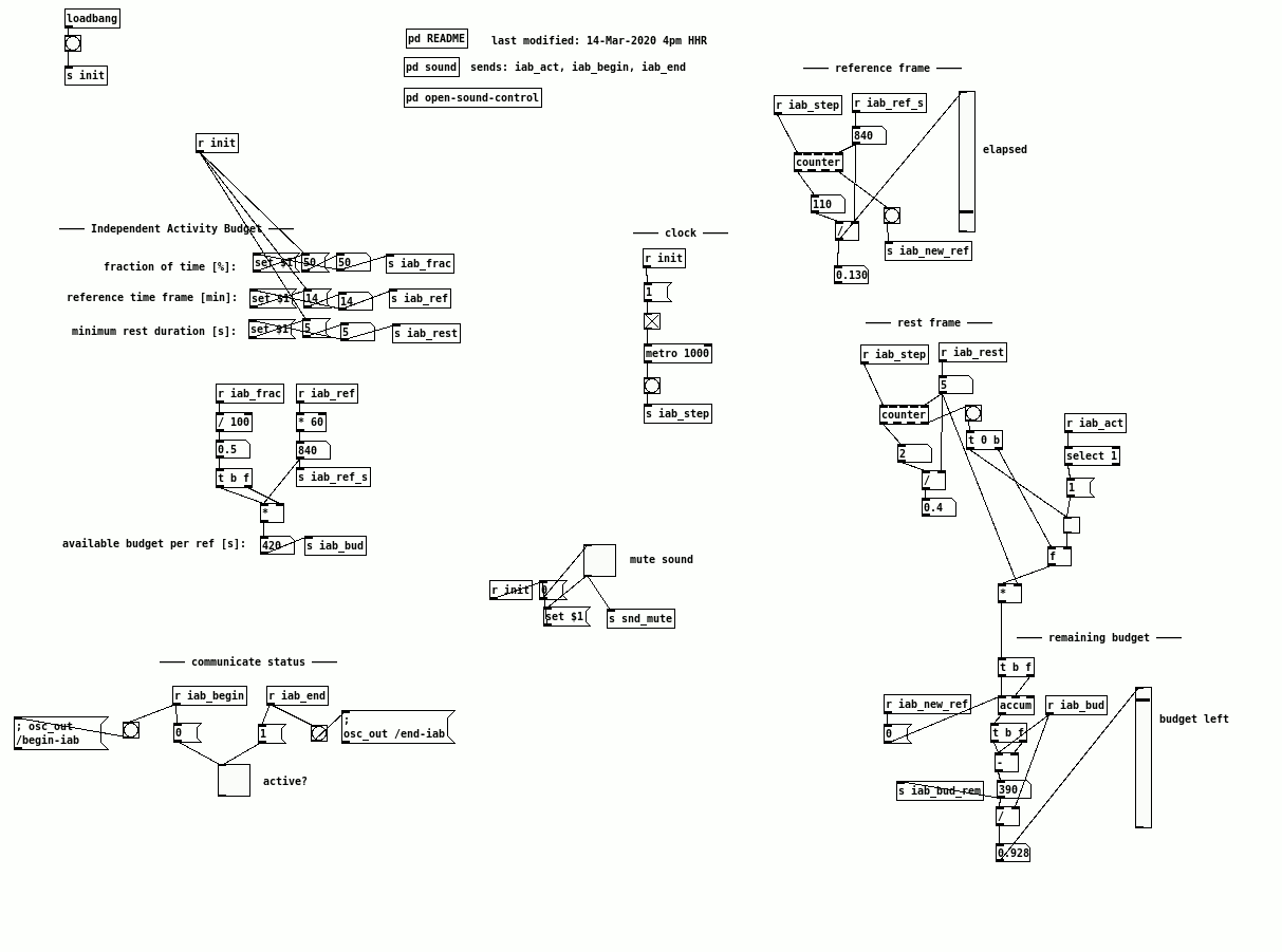 Knowing how many layers are active is a useful information to others, for example if layer X knows that all other layers are silent, it could perform a particular listening act or adjust its feedback parameters, knowing that the currently added sound solely comes from itself. Therefore, I suggest to add the messages /begin-iab and /end-iab that each layer emits to inform the others. ↗