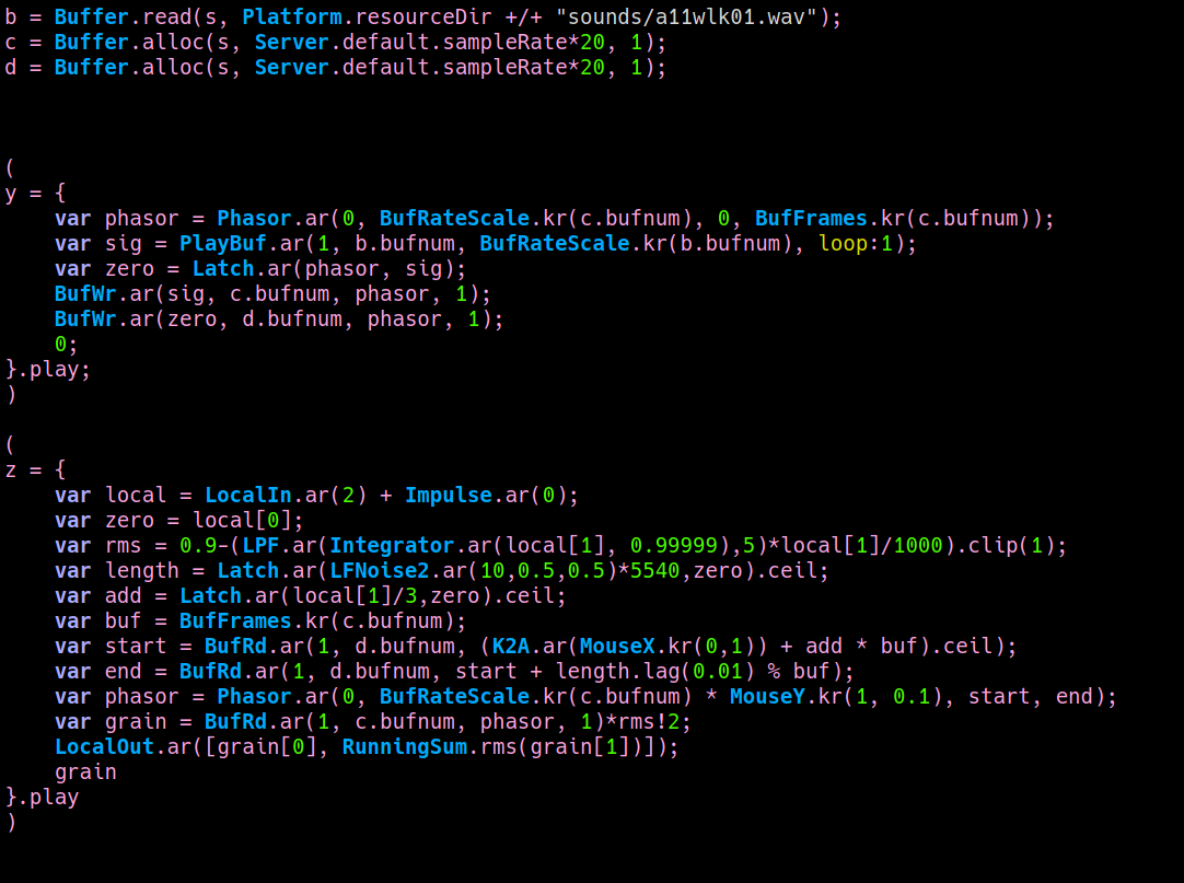 Another thing I thought of is to introduce some sort of memory in the system, in order to decouple the process from the "here and now" and from this feeling of "direct trigger". So I introduced a buffer, and started thinking about strategies to deal with signals from the past. One of the first questions for me was how to read these signals back. I wanted to avoid windowing, so I thought about starting reading at zero crossing. And I was using a rudimental segmentation algorithm to isolate, for example, steps and play them back. Nevertheless this sounded a bit cheap, like a classic sampling machine. I thought to use smaller periods and I realised I could even start and end reading at successive zero crossings. I ended up with a sort of stutter / granulator that has some interesting sound qualities. Then I realised I could modify any of its parameters, as long as I do it inbetween zero crossings. This way I avoid discontinuities and the signal is clean. So I introduced some self-regulating mechanisms that modify the process in between ZCs. Code and some examples are here