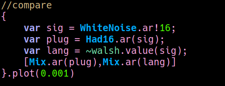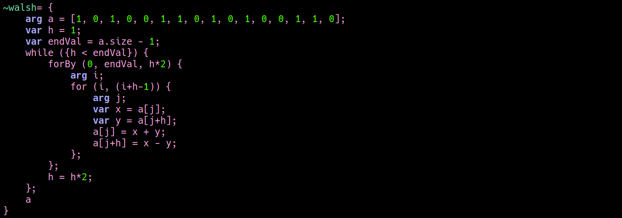 In the original algorithm I implemented, a Hadamard matrix is used to iteratively recombine the sizteen delay lines in order to simulate an ideal room's reflections. A couple of weeks ago I was speaking with Luc Dobereiner and he told me that Hadamard matrices are also used in the Fast Walsh-Hadamard Transform. FWHT is an efficient algorithm to computer the Walsh-Hadamard transform, that is a generalised class of Fourier transforms thorugh which is possible to decompose a signal in a sum of square waves. I didn't know about it and, since it is easy to implement in the time domain, I thought it would be nice to use the same kind of process both for sound processing and analysis. So, following the pseudo code here, I did some tests in SC. What I didn't know is that the Walsh functions ("square waves") used for resynthesis are not ordered according to their pitch (as in Fourier), nor it is easy to determine their timbral characteristics, becasue they can be quite complex. So I had to drop the idea of using the FHWT for analysis purposes, but since the algorithm is much more efficient than the first one I implemented, I reformulated my old reverberator accordingly, that now looks like this