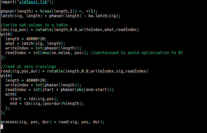 in this way, it is possible to playback snippets of the sampled input signal without using any envelope. just start and end reading at indexes where a zero crossing happens. in the sc implementation, given a position and a desired duration for the snippet, the most close corresponding zero crossing indeces will be used to start / end the playback. this is the faust implementation, using a faust primitive called rwtable: