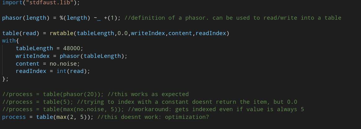 in this implementation, I need to read values from the zero crossing table in order to retrieve valid zero crossing indeces to play back from the buffer where I'm sampling the input signal. in the rwtable primitive the last argument is the reading index. So I expected to be able to access values by directly indexing here with integers. It turns out it's not possible: when trying to index with an integer, the primitive always returns 0.0 if I substitute this by some form of "signal", even if the signal is constant, this works as expected. I suspect this is a bug that results out of the optimization process...