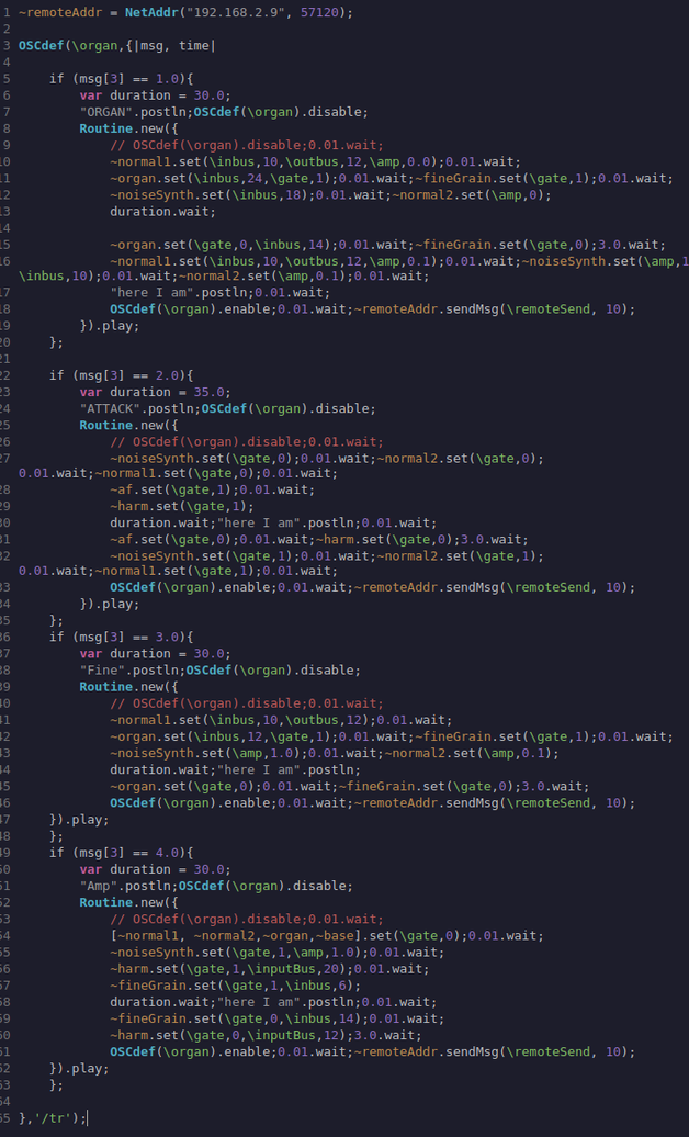 -Then there is this 'timing' issue. Things should happen in order, such as stop the synth-reorganize them-start playing for a while-reactivate the OSCdef. I used Routine for it, (just because I know it) but would it be great to know if there is a better way to do it.