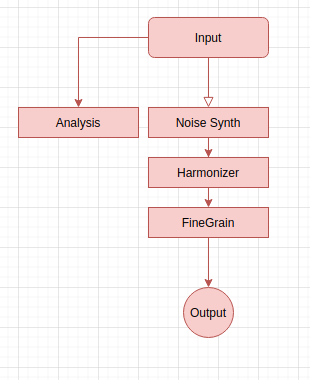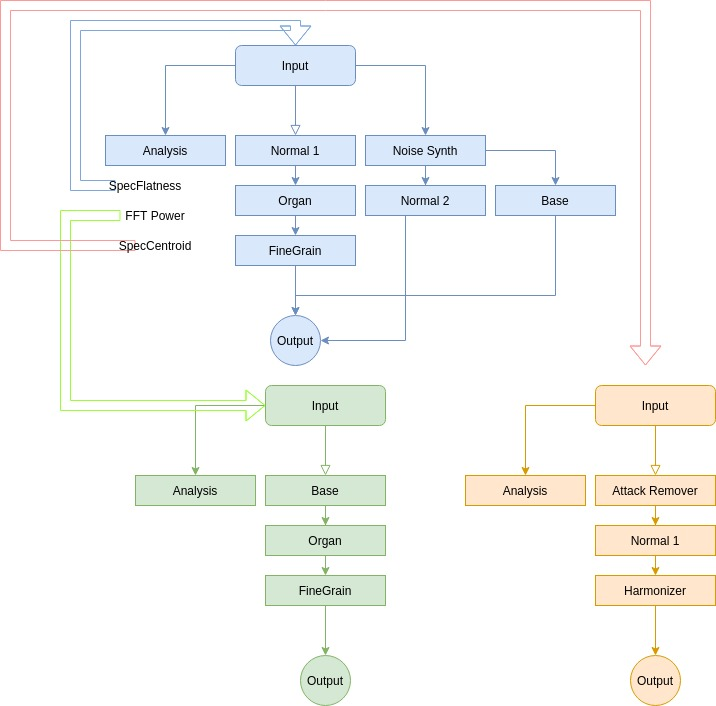 A new set of module. I wanted this extraction of noisy elements of the input sound to be developed. Here it becomes cloudy by the granular synth after being harmonized again. The next step will be to have a little more control over the arguments for the harmonizer, so that the harmonic elements also vary depending on the characteristics of the input signal. It is overall still necessary to tune it better.