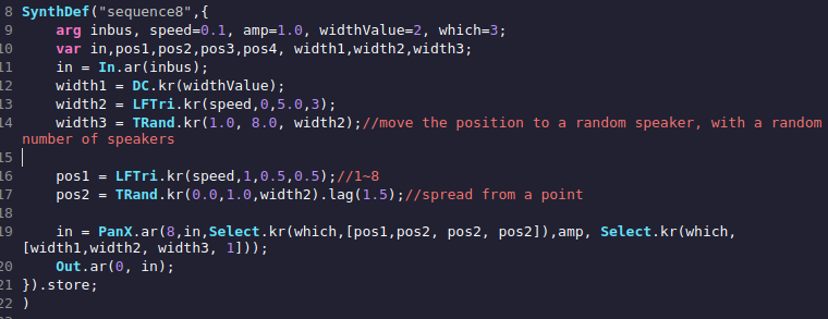 The implementation of the spatialization plan. 4 different options are made following to the plan. The choose will have to be made in the osc. Not yet tested in RBP.