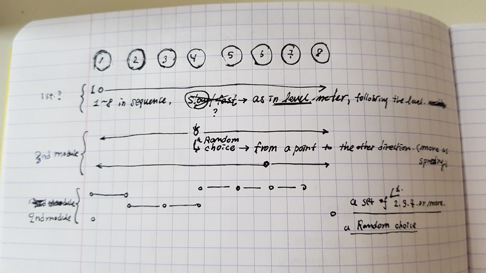 Now the OSC data going from the laptop is a random choice between 1 and 4, and when a module is triggerd and after being played for the duration given, it sends back a 'cue' to the laptop (msg:10) to get a next trigger for a new module to be played. Accordingly Analysis module is not running in this test. This is just for the test.