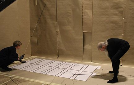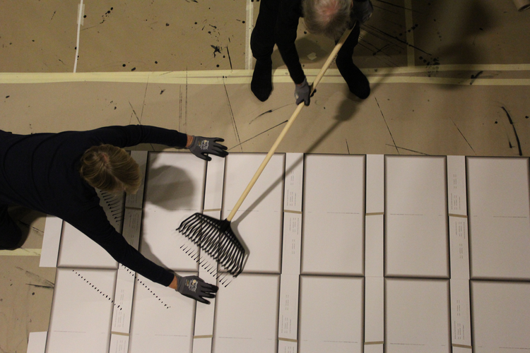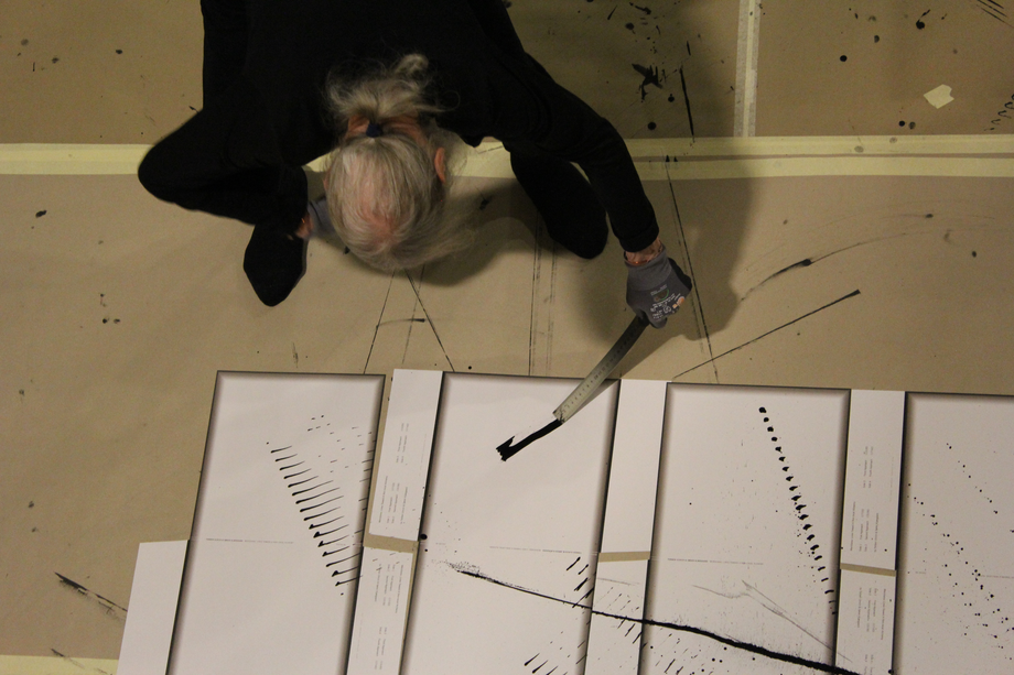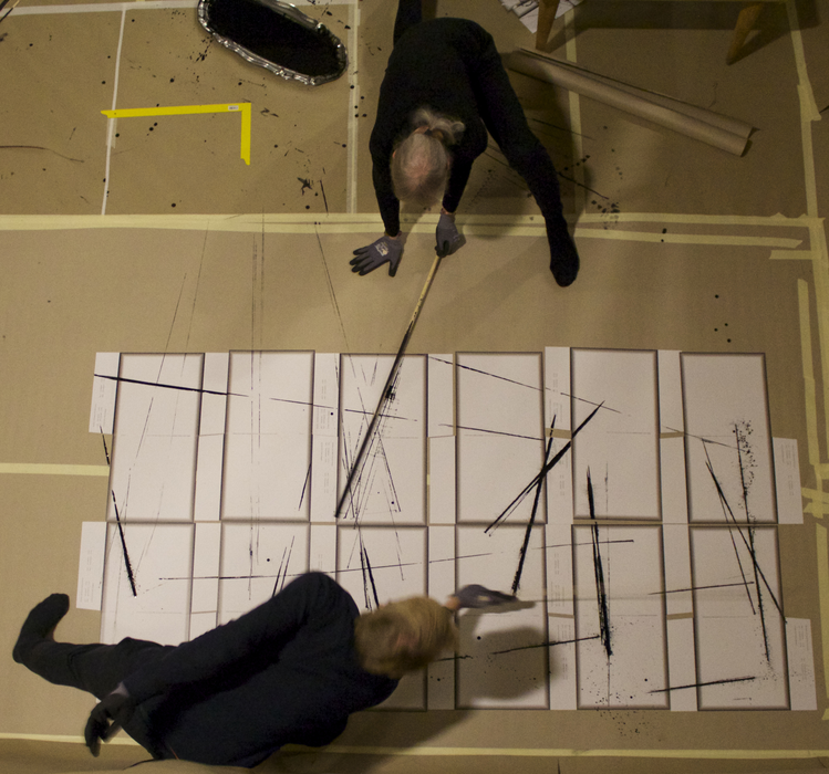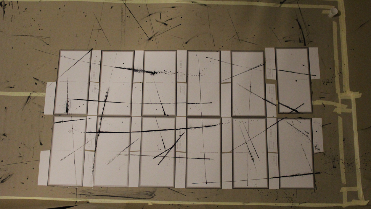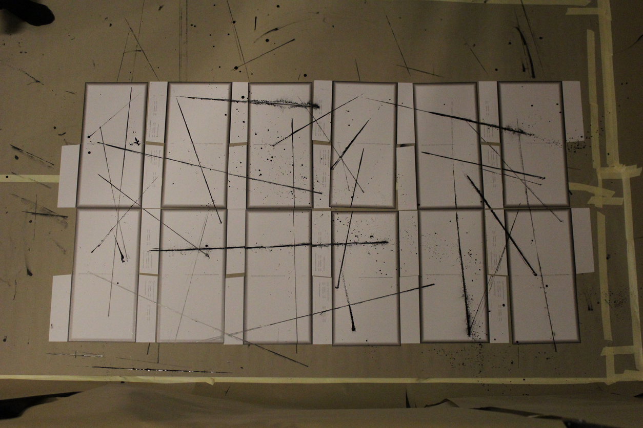 Step 3. Applying black ink on the canvas by use of sticks, piano strings and rake. The tranversal lines of ink cut across and beyond the cover frames, connecting the covers in a region of intersecting lines (meridians).