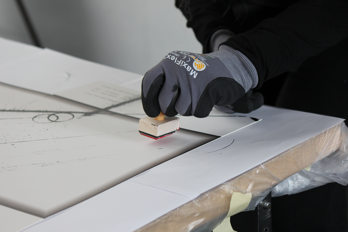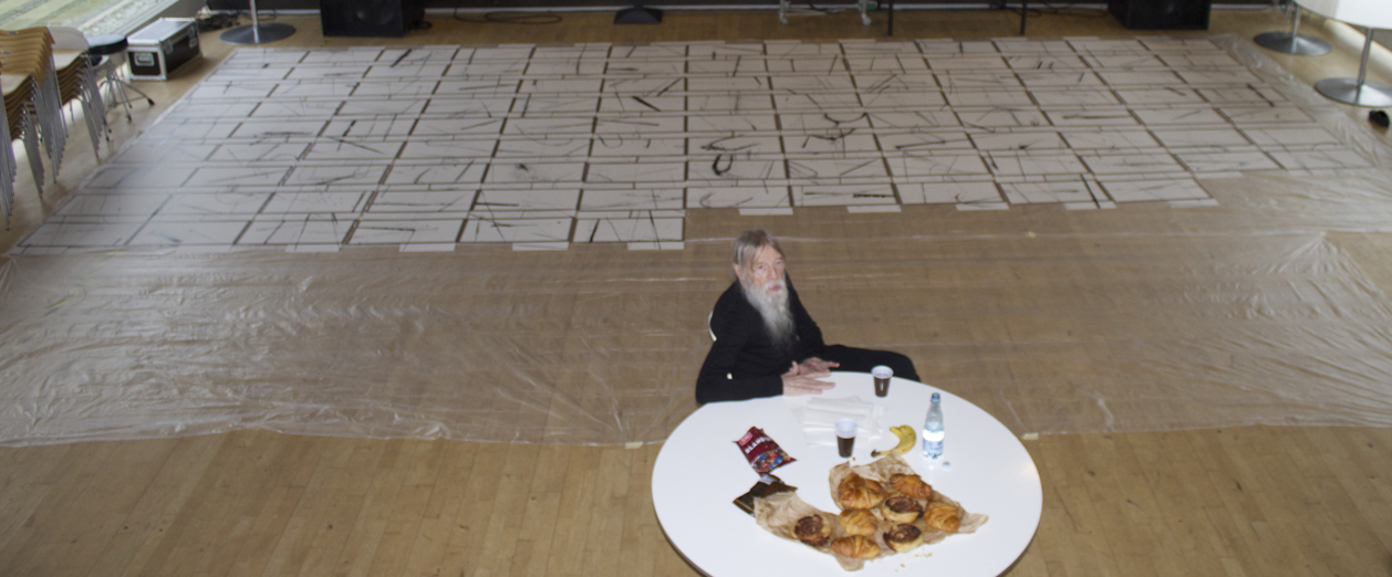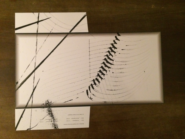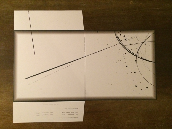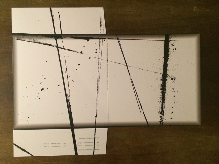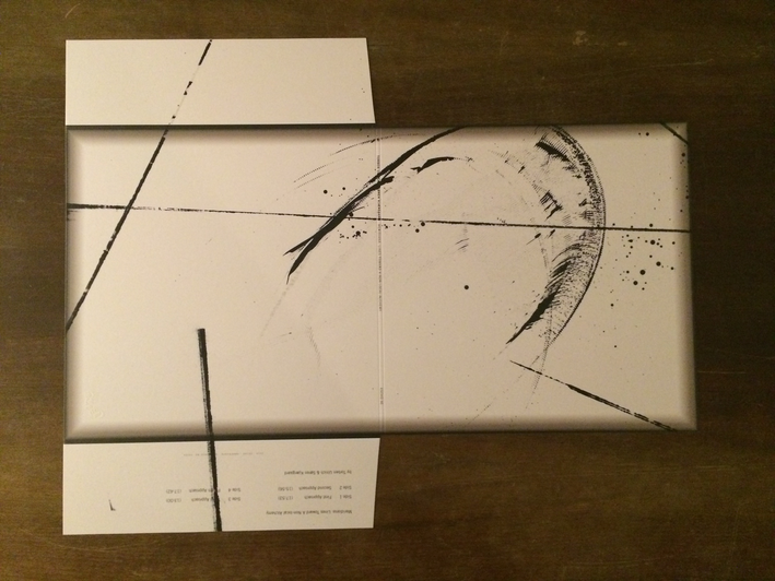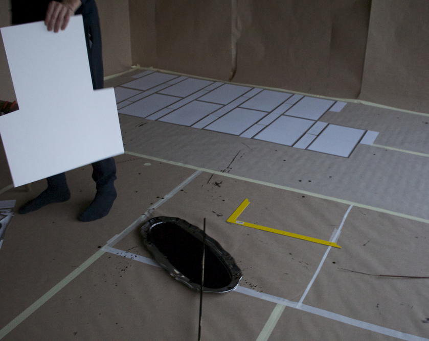 Step 3. Applying black ink on the canvas by use of sticks, piano strings and rake. The tranversal lines of ink cut across and beyond the cover frames, connecting the covers in a region of intersecting lines (meridians).