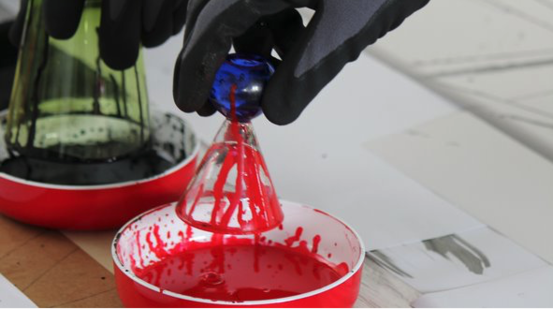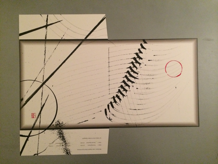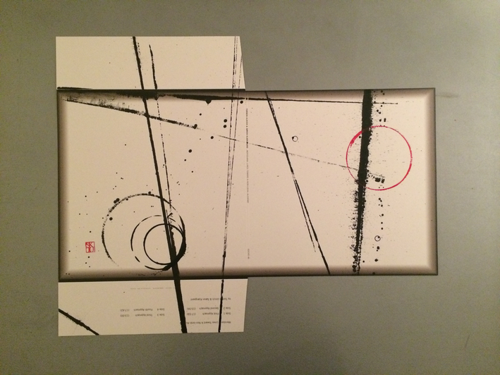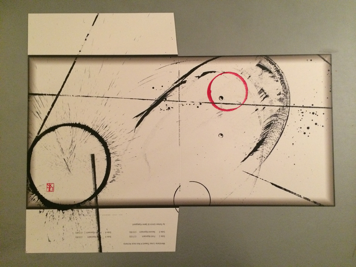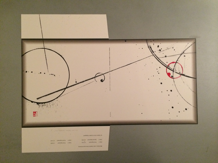 Step 5. Applying circular shapes (full circles, half circles and in-between) with black and red ink on the covers by use of cups, glasses and bowls of different sizes. Where the straight intersecting lines make up varying degrees of longitudal and latitudal lines, the circles represent the global aspect of the meridians.