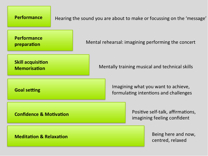 Mental training and the use of imagery can be used throughout the learning and performance process. Each stage of learning can benefit from mental training: for preparing for practice or performance as well as gaining self awareness, do exercises in meditation and relaxation; exercises for setting goals and intentions and boosting confidence and motivation; methods for acquiring motor skills and learning and memorising repertoire, as well as exploring and deepening musical ideas; making playing more efficient by reducing muscle activity and practice time helps to recover from and avoid injury; having exercises to practice performing can reduce performance anxiety and knowing how to focus during performing helps ensure musical and technical clarity and proficiency and a convincing performance.