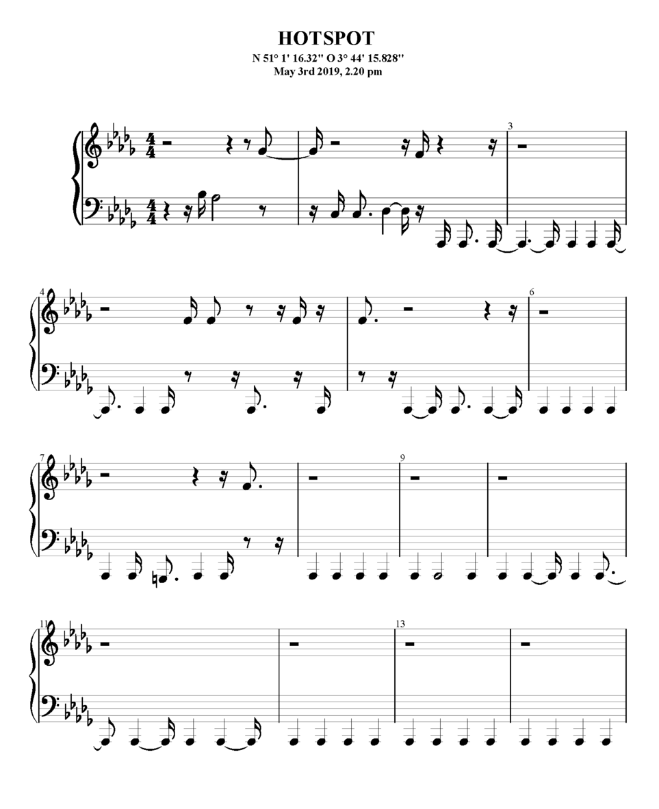Several sound recordings were made in the course of the project [fig. 35] and later converted into sheet music scores [fig. 36]. I also ran a recording through a photosounder software program to create a visual output of the captured cosmic radiation, which was printed on a strip of photo paper 7.25 cm by 585 cm in size [fig. 37]. The different versions of Hotspot illustrate that each image-making framework prescribes how we (can) visualise the world, in the sense that it also constructs and interprets reality in a preconditioned way.