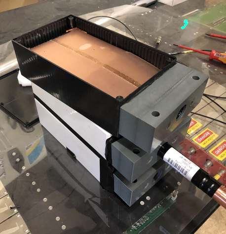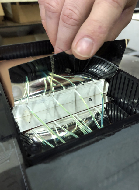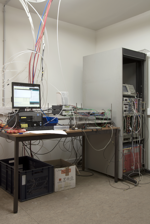 What follows is a short description of the technical setup used to create Hotspot. Two detector arrays were each composed of a photomultiplier tube combined with a slat of plastic scintillator – a luminescent material that, when struck by an incoming muon, absorbs its energy and re-emits this energy in the form of light. A particle passing through the scintillators triggered the emission of some of the photons it contains. These photons were then guided along the scintillators by an optic fibre cable until they reached the photomultiplier tube, which generated an electrical impulse [fig. 31, 32]. Parasitic noise from natural terrestrial radioactivity was eliminated because muons travel at a similar speed to that of light, and therefore cross almost simultaneously. When a muon hit both photosensitive detectors at the same time, a threshold that separates background noise from pulse was applied to clean up the received signal. Only when the input signal from both photodetectors surpassed the installed threshold was a block pulse generated as output. This negative pulse needed to be converted to a positive voltage of maximum 5V for the Arduino microcontroller to be able to read it. A fast data acquisition program then checked whether or not a signal hit the Arduino pin, saving the interval between two impacting muons. Each interval was assigned a specific tonal value, which the microcontroller sent as an analogue pulse to an audio driver that amplified the signal before transmitting it as a MIDI format to a loudspeaker. Every sent pulse had the same length of 300 milliseconds: the only variation was the interval between, and the frequency of, the notes.