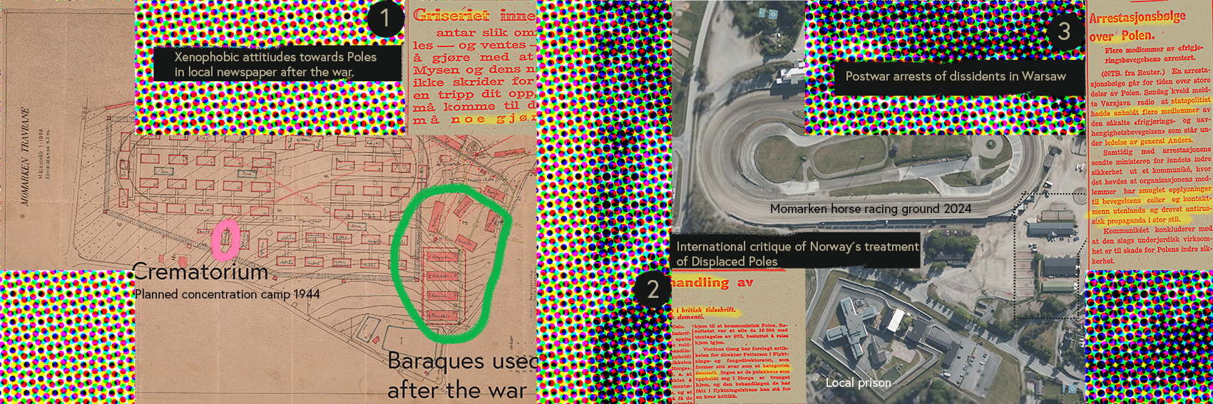 Figure 4: Momarken horse racing ground: A geographical spot with historic significance: Soldier baraques for Nazi German troops 1940, Soviet forec labourers baraques 1943, Grini prisoners 1945, plans for concentration camp (never completed) 1945, Polish DP 1945-47, Jewish DP 1947-48, social housing 1948-ca 1955, amusement park 1950-2013, social housing 2020-? Illustration by the author.