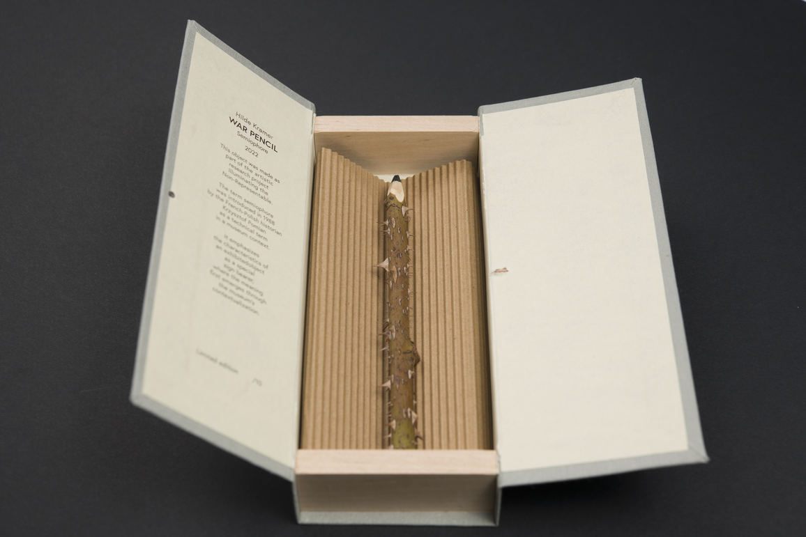 Object as three-dimensional illustration: War Pencil derives from WPII B-O-O-K. Wood, cardboard, paper, digital print, Hilde Kramer was author of this work, that discusses the concept of semiophores. Exhibited in the exhibition Work in Progress, KMD 23rd of February 2023, Falstad summer 2023 and at the illustration biennale in Ljubljana May-June 2024.