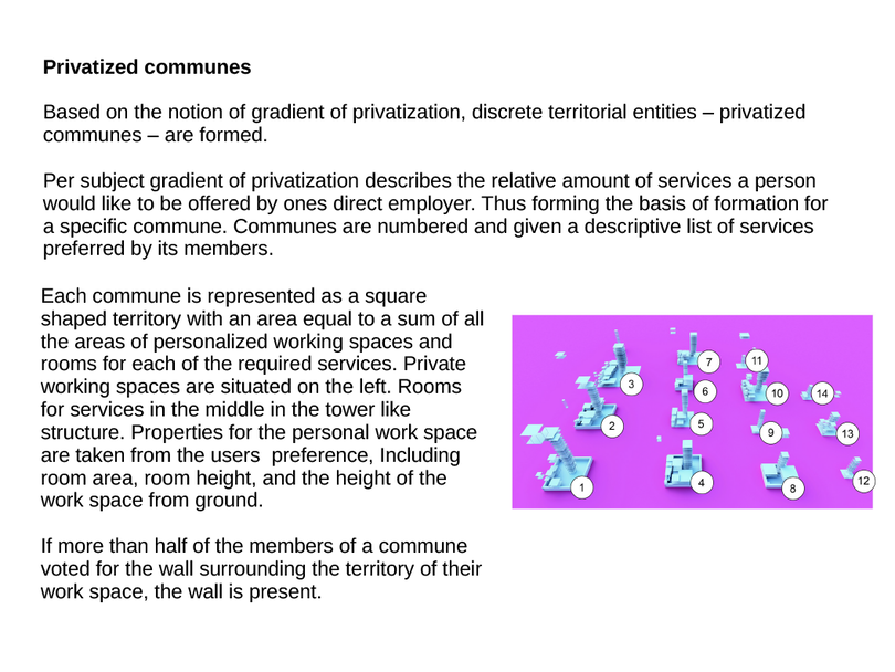 An artistic experiment by Komar and Melamid, Painting by Numbers (Komar, Melamid 1997), manifests an artistic technique that used a polling mechanism to construct artistic imagery. In their study, they collected data about preferences in painting to devise the most beautiful painting. Using accumulated data and relevant means in specific attributes, they compiled the most popular elements to create paintings. In my practice, I also use data to generate imagery but, instead of using statistical averages, I interpret data in ways that consider every individual separately. This means that generalisation does not exclude individual profiles, but rather groups form by relative distance in data space. Also, beauty is not my primary interest, but rather social conditions. The special properties of working spaces in Privatized Communes are personal preferences. In providing spatial representations, I use a combination of collected data and generative algorithms, specifically an algorithm that uses random numbers and instructions about placement logic to generate the layout of the rooms in a group. My practice to explore social structures therefore incorporates formalist generative techniques such as those explored by Manfred Mohr (Keiner 1994) or Sol LeWitt and others.