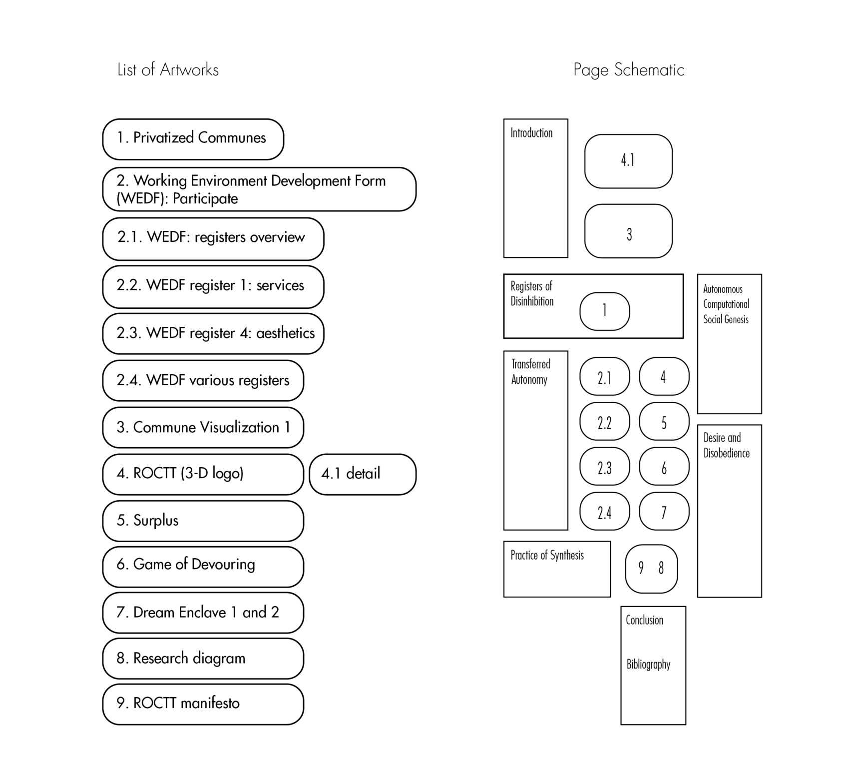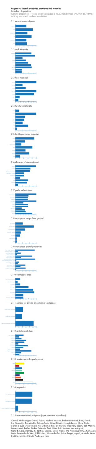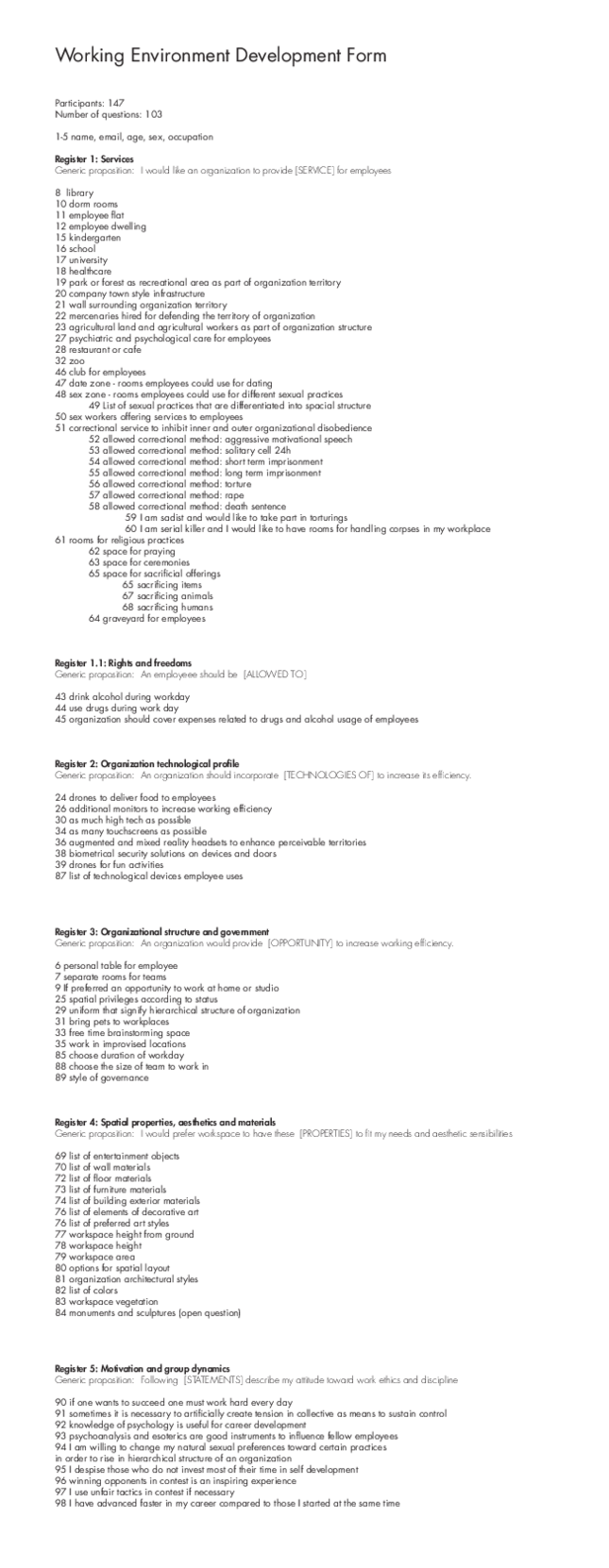 To gain insight into a collective psychic environment, it became necessary to disinhibit the imaginary process in a way that it was no longer directed by actualised stratifications of organisational structures. Processes of disinhibition proceed through interconnected proposals for workplace development (Working Environment Development Form (2), shown below). These proposals connect the actual to the virtual, always departing from a specific situation of an individual’s immediate surrounding environment and directed toward a collective imaginary sphere. In conceptualising the process of disinhibition, I follow Peter Sloterdijk’s reasoning as outlined in his book, In the World Interior of Capital. For him, a subject is an actor that transforms theory into practice; this transformation is disinhibition, and helps to achieve specific goals (Sloterdijk 2013: 57). In the case of Working Environment Development Form, theory is a set of proposals to develop an ideal working and living environment. These proposals make up the registers of disinhibition (8). Different sections or registers of the form enable developments in different areas of a working environment. Register 1 (2.2), for example, deals with services an individual would like to receive as part of an institutional suite. I interpret preferences in this section as gradients of privatisation (Privatized Communes [1]). These are the gradients that make up the pathways of capital through a collective virtual environment. Register 4 (2.3) configures the aesthetic and spatial properties of a working environment.