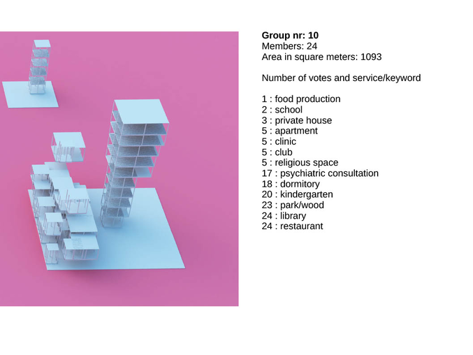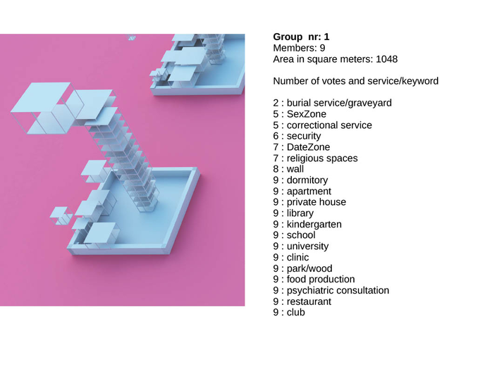 This graph formation is a multi-agent generative network that forms the basis for the next steps in the generative processes (geometric generation, for example, as seen in Privatized Communes [1]). It provides direction to processes of genesis that can proceed through various layers of these networks. Since every member of a group has a link to the initial poll data, we can make an arbitrary number of cascaded groupings within any group or between a set of groups. It also provides access to initial data when needed by a procedural algorithm; for example, getting individual workroom parameters while generating geometry for a specific group.