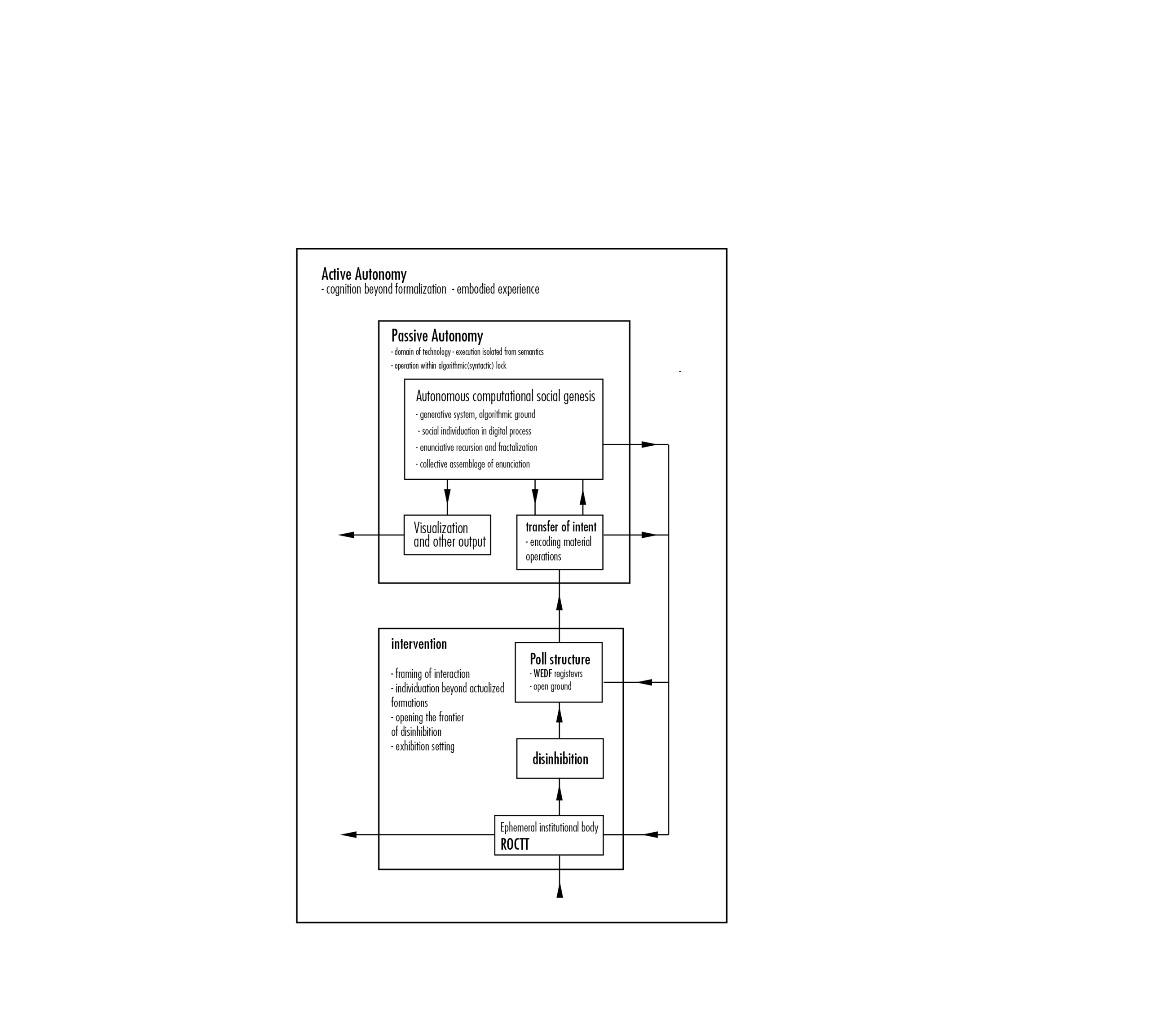 I elaborate on the problem of how a static poll can act as a base for collective individuation in the section titled ‘Desire and Disobedience — Deterritorializing the Opinion Poll’. In short, no static formation can capture the pre-individual field of individuation. Instead, any technical layer must be flexible enough to enable movement between pre-individual field and technical signification. The section titled ‘Transferred Autonomy’ digs deeper into the question of how the human subject can relate to the digital environment and enquires into the relationship between human and computational autonomy. The section titled ‘Computational Autonomous Social Genesis’ describes different artistic techniques combined in this practice to analyse and enable collective individuation in the digital environment.
