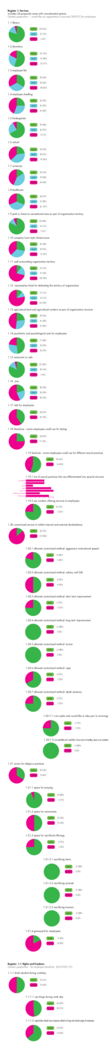 The algorithm that creates these groupings takes, as an input, a register containing the set of elements. It traverses the whole dataset, grouping records that have as many similarly directed preferences as possible. It groups together these records based on the highest common denominator. Groupings represent individuals that, together, have the least possible number of antagonistic preferences. Note that having a common preference in a negative direction also means less antagonism in the group. Furthermore, the register that is used to traverse the initial data is Register 1 in WEDF in the case of Privatized Communes (1), since the aim is to search for structures that are formed in relation to required employer-provided services. It signals to what extent an individual prefers a company-like environment and what makes up the specifics of this preference, in terms of a constellation of services.