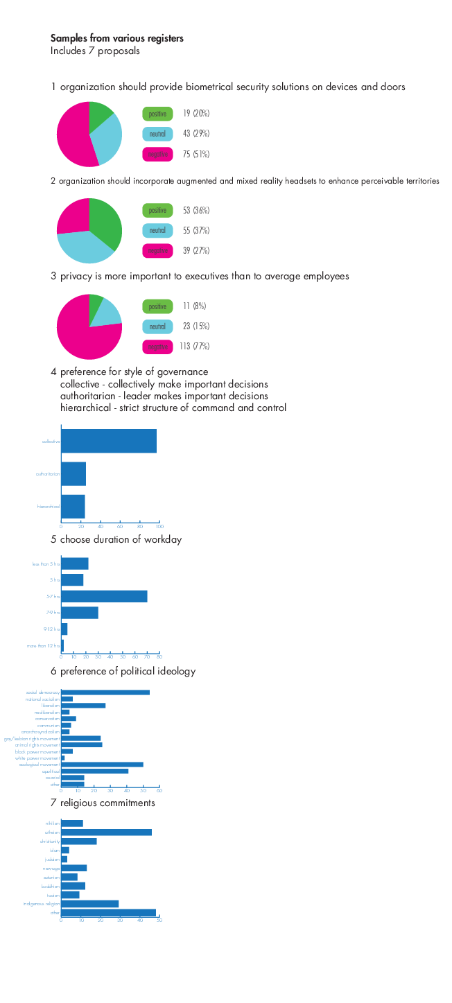 The former section examines notions of individuation and the technical object, as proposed by Gilbert Simondon (2016), which is also the core theoretical reference for this research. Bernard Stiegler (2019) provides a valuable re-reading of Simondon, stressing the immanent connection between digital tertiary retention and collective individuation. This idea is relevant here since it places technology at the centre for studying individuation and transindividual protention. An opinion poll is used to gather input from various individuals and make the exploration of different individuations possible serving as a concatenation of registers of disinhibition. The formulation of disinhibition (Sloterdijk 2013) is a process in which a subject converts theory into practice in order to shape surrounding conditions, providing a means to open up territories for individual perceptions of ideal working and living conditions. A presentation of the structure and principles of this specialised survey forms the core of the chapter. The prospect of discovering new directions of social genesis, beyond specific institutional or industrial goals, explores individuation beyond actualised socioeconomic structures.