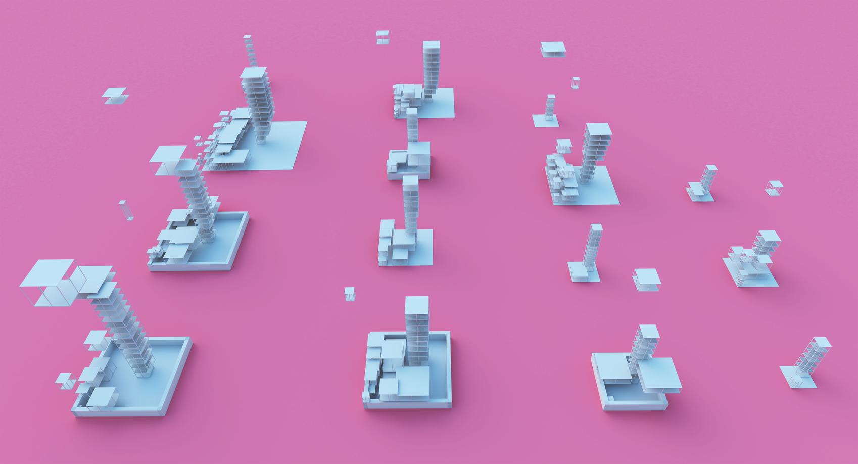 In the case of Surplus (5), Craig Reynolds’ (1987) boid structure offers a starting point and is further developed to enable and increase complexity arising from simple rules. The boid’s model operates as a swarm or group of agents, each of which regulates the swarm’s movement based on proximity to other members and the direction of the entire swarm. In the case of Surplus (5), the algorithm functions differently: there is no single direction for a group but multiple different ones. It makes the dynamic more complex and resonates with the differentiation of regions presented in Privatized Communes, only this time focusing on the real-time dynamics of morphogenesis. As the number of directions increases or decreases and the mutual reactions vary per agent, further, more complex dynamics arise. These simulations study the possible structural changes in formations that are based on WEDF poll structure. The 3-D animation of Surplus (5) is a real-time screen capture of a simulation comprising 1500 agents, rendered using a real-time global illumination algorithm.