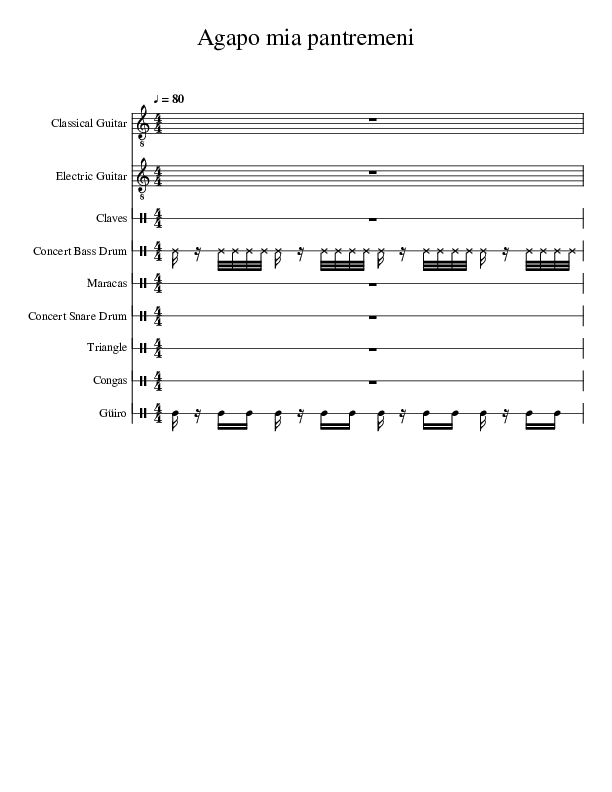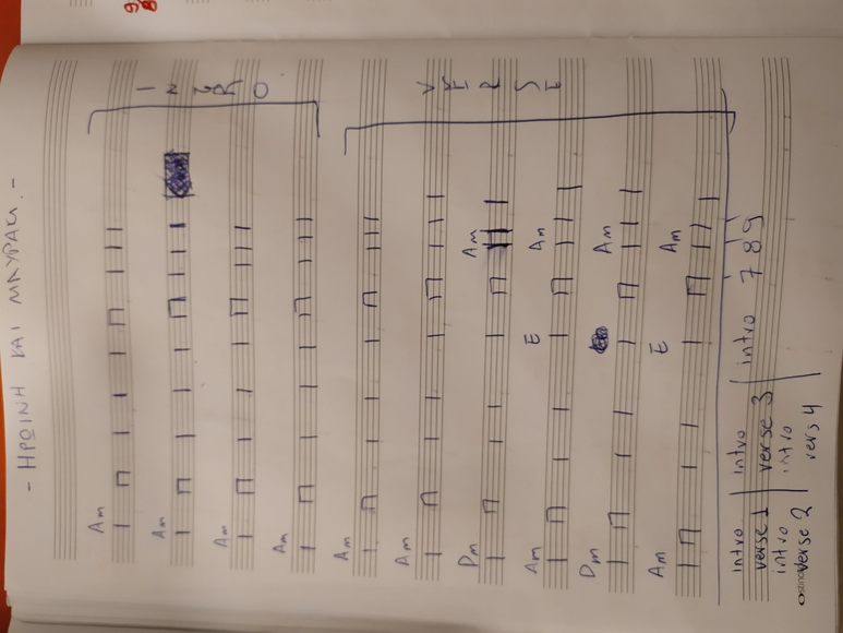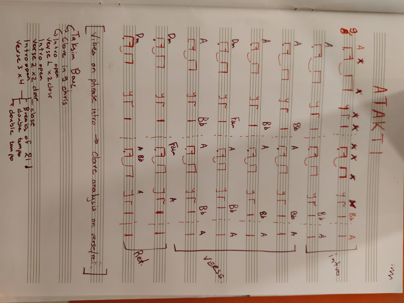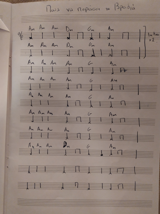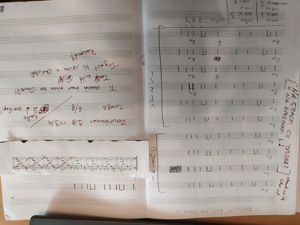 Breaking the music into harmony, melody and rhythm, and working separately with each element brought satisfactory musical results. The melody was primarily covered by Ilias our Bouzouki player, who is a virtuoso in the instrument. It was many times up to him and me to explain and teach the melodic lines by ear to the instruments that would need these lines. With continuous exposition and repetition, these lines sooner or later would become very familiar to all the players and would be played in a way very close to the original recording of the songs, but at the same time in a very fresh and unconventional way. For the harmony and rhythm, I would always prepare a sheet with the original rhythm and the chord progressions on top of the rhythm. This was my way of breaking down the rhythm for the players in order to understand the rhythmical behaviour of the song along with the harmony. Revisiting the original would trigger further changes in chords and rhythms. In some cases we would end up with a entirely new sheet, and in sometimes each of us made our own notes regarding the alterations.