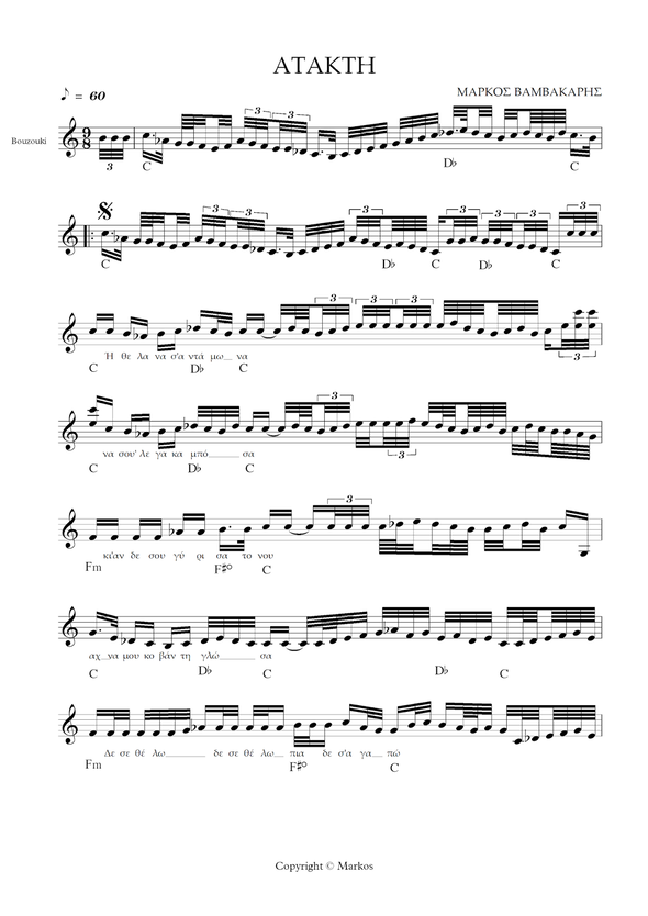 In this song the adaptation took a lot more time. In fact, as the adaptation was difficult, we needed to primarily change the feel of the melodic line to become more staccato. Once the song was possible the piano and the bouzouki returned to the original feel of the song. Once again in the lyrics there are wonderful descriptive lines. Apologies, but the direct translation or even the meaning of the lyrics can be unclear from Greek to English, as slang of that time is used.