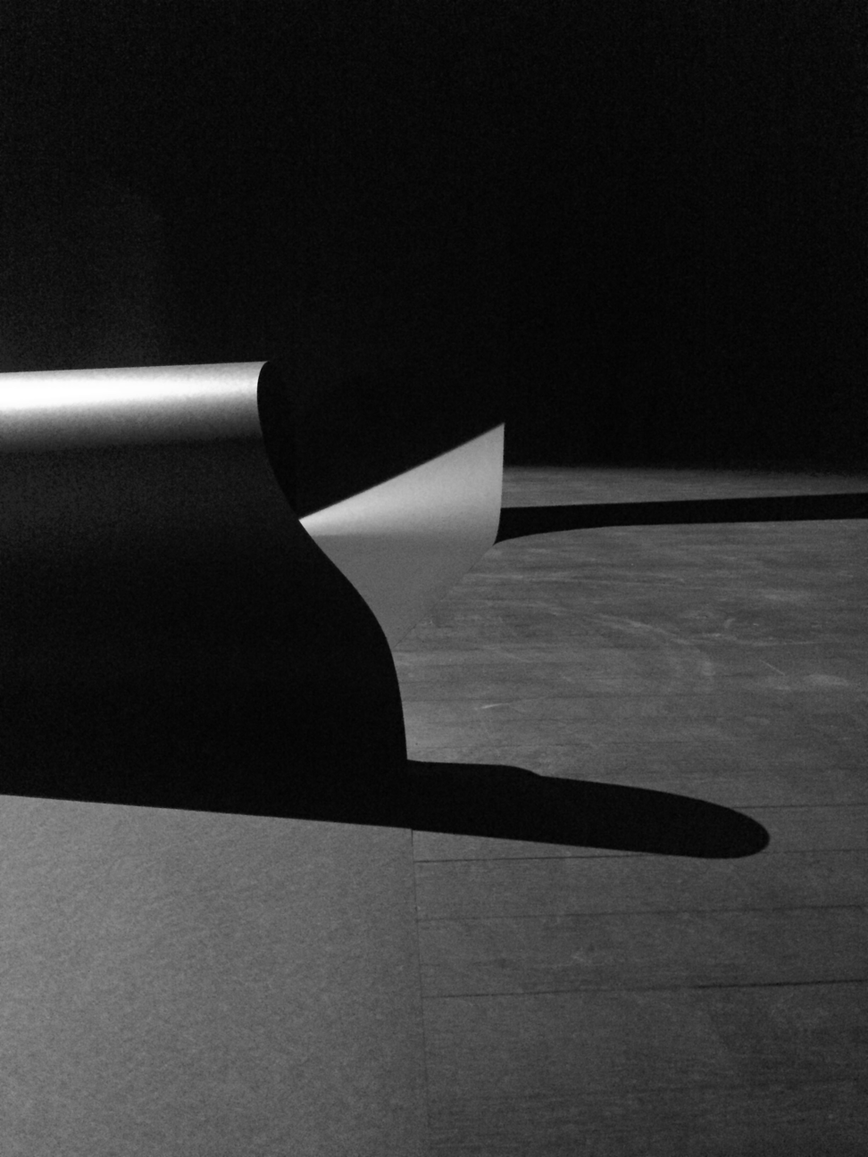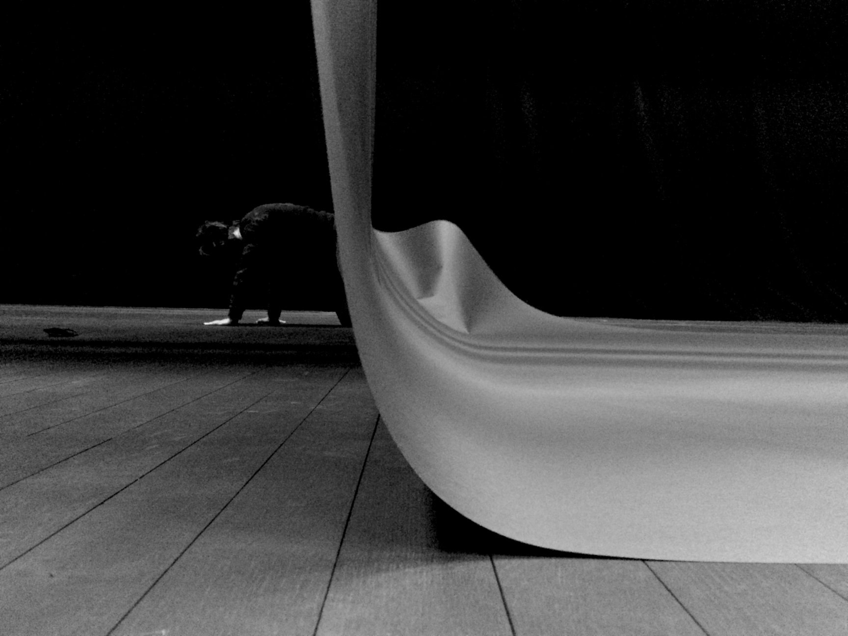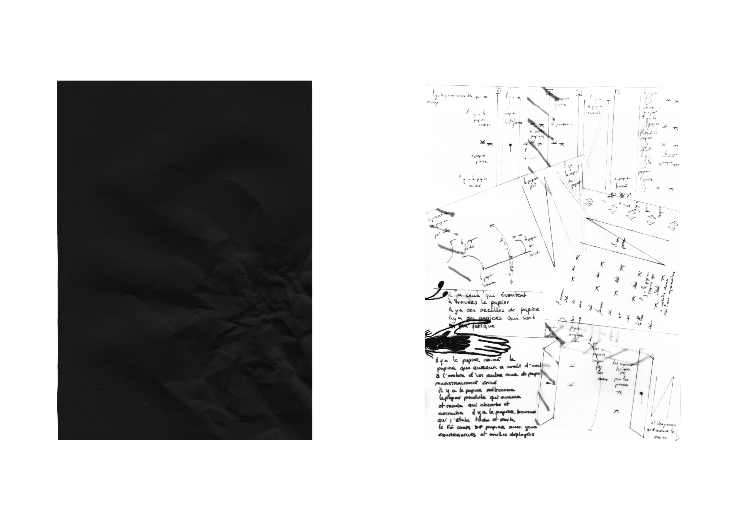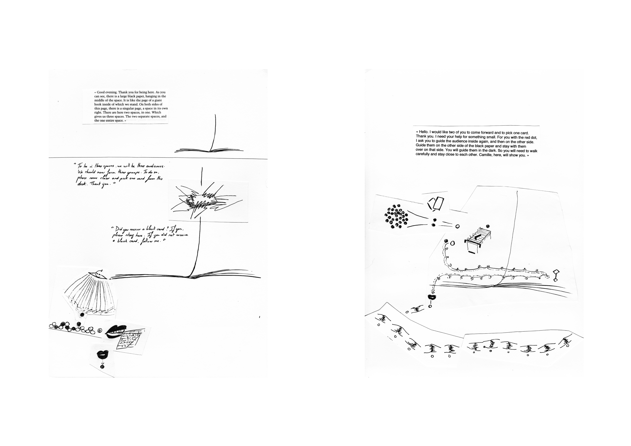 Papier multiforme, Papier comestible gathers magic and reading in a choreography of hands and eyes. The audience is invited to step inside a giant book, to research impertinent absence and to exercise ubiquity: being elsewhere, where they are not. In a vast and dark installation, dream-like scenes appear and disappear giving to see magic, dance, contrasted and fragmented images. In this obscure landscape that stretches and bends, the audience contemplates, reads, eats books, levitates, wanders, folds, and imagines.