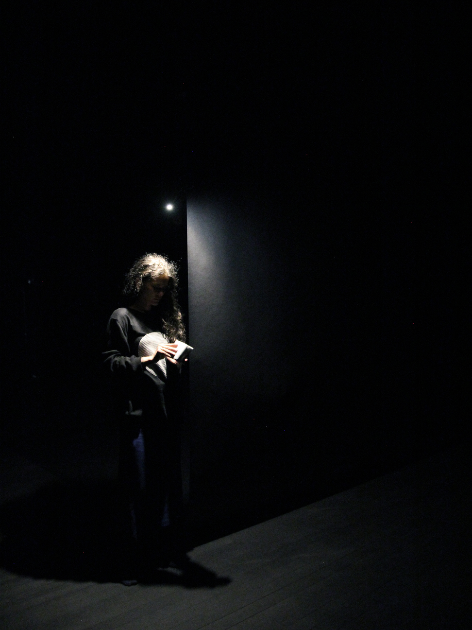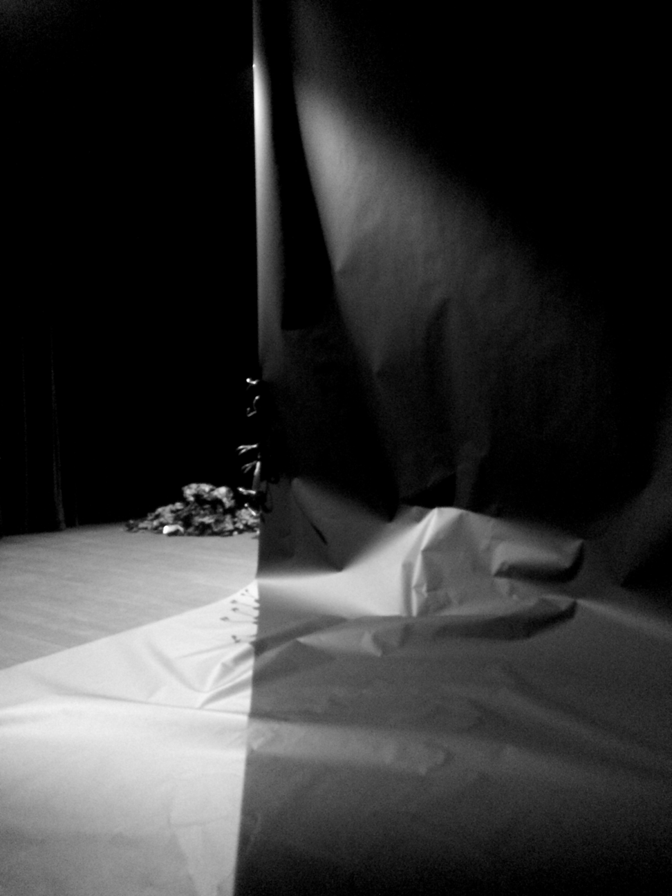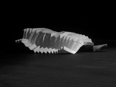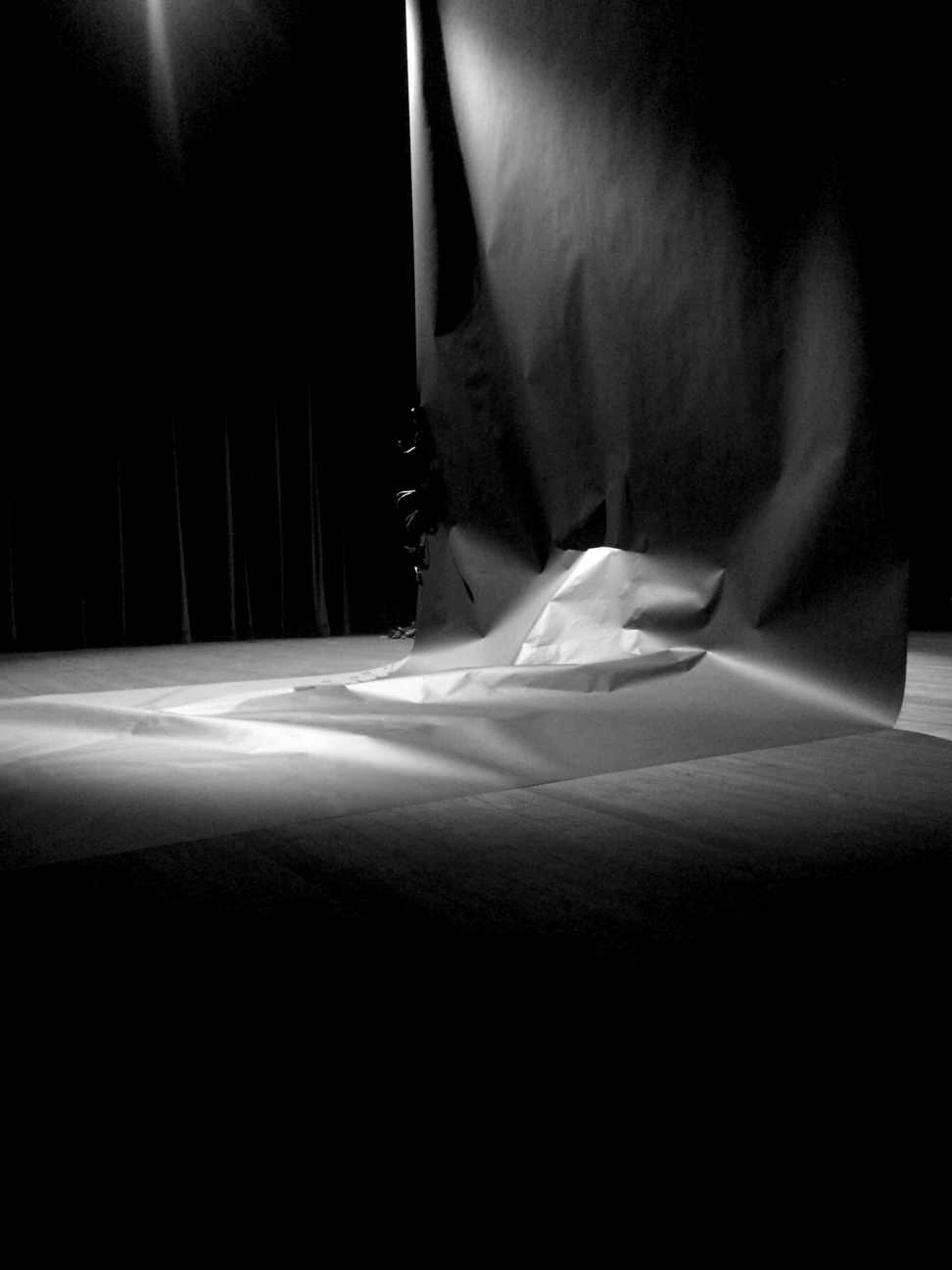Papier multiforme, Papier comestible gathers magic and reading in a choreography of hands and eyes. The audience is invited to step inside a giant book, to research impertinent absence and to exercise ubiquity: being elsewhere, where they are not. In a vast and dark installation, dream-like scenes appear and disappear giving to see magic, dance, contrasted and fragmented images. In this obscure landscape that stretches and bends, the audience contemplates, reads, eats books, levitates, wanders, folds, and imagines.