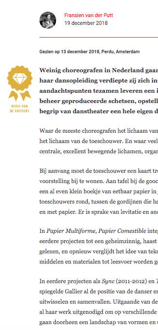 'Papier multiforme, Papier comestible is a choreography and an installation, a failed magic trick and a picture book which you can enter into.Like in a dream, everything has to do with everything' (Fransien van der Putt in De Theaterkrant 2018).