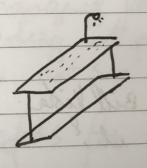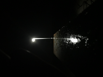 This experiment is best seen in a darkened room, so you can see the boundaries of the small light on the I-beam and how much it reflects on the water. One side is lit, the other one is covered in darkness.