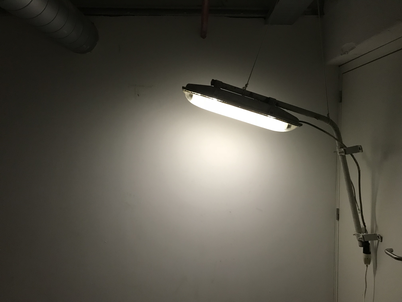 A person is waiting in an undefined (foggy) space. One fluorescent light lit up the space.