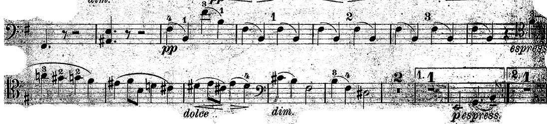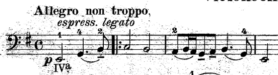 Additionally, there is the suggestion of portamento within a slur taking place at the beginning of the phrase when it occurs during the upbeat. A good example is the following theme from the Cello Sonata n.1, Op.38 in E minor, where Julius Klengel indicates to start with finger 3 on the upbeat (F sharp expressivo) and to make the shift with this same finger to A, resulting in an ascending 3rd. In addition, we find a similar kind of shifting with the same finger in next beat, where 2-2 is written in the chromatism between G sharp and G natural. Similar examples in slurring can be found in bars 3 and 5.