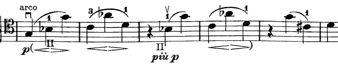 The most prominent fact is that portamento usually takes place within slurs, resulting in audible shifting. They are usually at the end of phrases, half-phrases or followed by a diminuendo.In the two following examples from the Piano quartet n.1, Op.25 in g moll edited we can find several portamenti used within slurs. We can interpret this thanks to the written fingerings from Ossip Schnirlin. In this first fragment of the opening of the first movement, the cello phrase in bar 5 is indicated to start with the first finger (on II, or string D), which suggests a descending 4thshift between F and C sharp happening on I (string A). This is followed by another shift in bar 6, which is suggested by the idication of finger 2 and denotes a possible portamento between G and B flat (an ascending 3rd). In bar 8 we can also read the written finger 1 as a portamento suggestion between G and D (descending by a 4th) and finally the phrase concludes in bar 9 with a shift descending by a 3rd(between C and A), which is suggested by the presence of finger 3 being indicated.