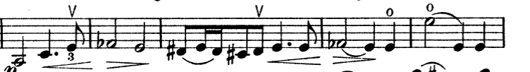 Similar examples are found in the following fragment. In the second bar the 4thfinger is indicated on F, which suggests a descending 3rdbetween A and F in a slur. This is followed in bar 3 by another slur which includes a possible portamento, suggested by the written finger 1, between B and C sharp (ascending by a 2nd).