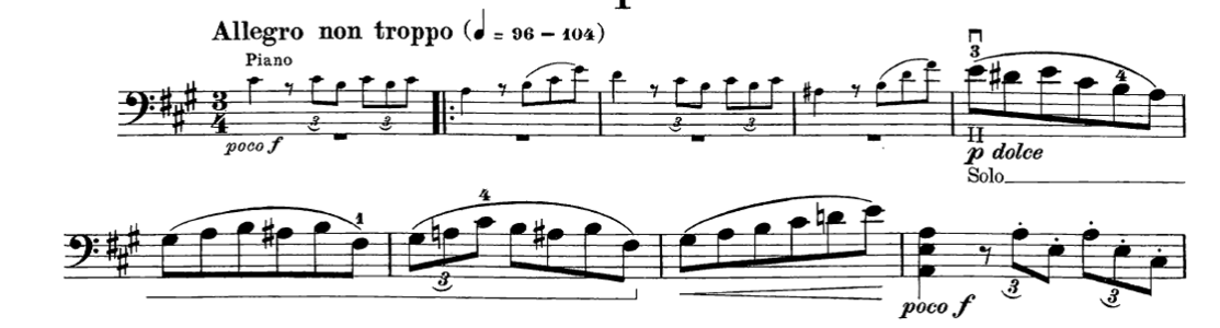 Cello Sonata n.1, Op.38  in E minor edited by Julius Klengel, 1stmovement, bars 76-91.