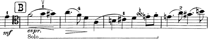 Similar examples are found in the following fragment. In the second bar the 4thfinger is indicated on F, which suggests a descending 3rdbetween A and F in a slur. This is followed in bar 3 by another slur which includes a possible portamento, suggested by the written finger 1, between B and C sharp (ascending by a 2nd).