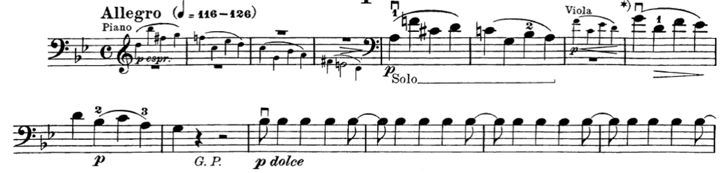 The  most prominent fact is that portamento usually takes place within slurs, resulting in audible shifting. They are usually at the end of phrases, half-phrases or followed by a diminuendo.In the two following examples from the Piano quartet n.1, Op.25 in g moll edited we can find several portamenti used within slurs. We can interpret this thanks to the written fingerings from Ossip Schnirlin. In this first fragment of the opening of the first movement, the cello phrase in bar 5 is indicated to start with the first finger (on II, or string D), which suggests a descending 4thshift between F and C sharp happening on I (string A). This is followed by another shift in bar 6, which is suggested by the idication of finger 2 and denotes a possible portamento between G and B flat (an ascending 3rd). In bar 8 we can also read the written finger 1 as a portamento suggestion between G and D (descending by a 4th) and finally the phrase concludes in bar 9 with a shift descending by a 3rd(between C and A), which is suggested by the presence of finger 3 being indicated.