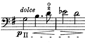 Additionally, there is the suggestion of portamento within a slur taking place at the beginning of the phrase when it occurs during the upbeat. A good example is the following theme from the Cello Sonata n.1, Op.38 in E minor, where Julius Klengel indicates to start with finger 3 on the upbeat (F sharp expressivo) and to make the shift with this same finger to A, resulting in an ascending 3rd. In addition, we find a similar kind of shifting with the same finger in next beat, where 2-2 is written in the chromatism between G sharp and G natural. Similar examples in slurring can be found in bars 3 and 5.