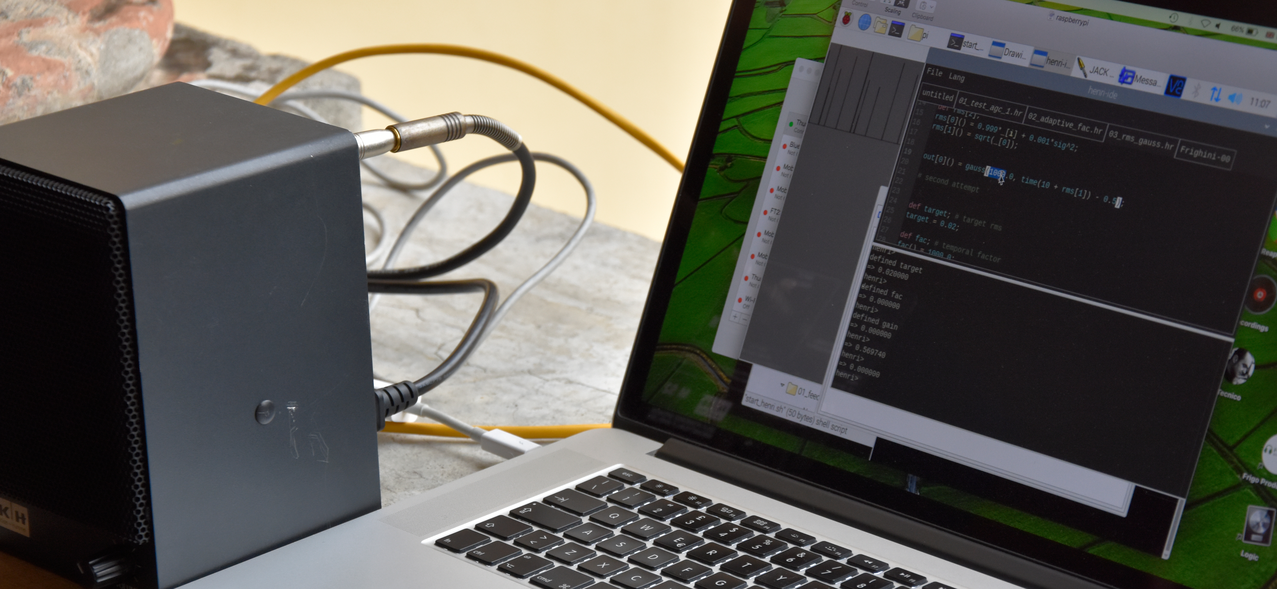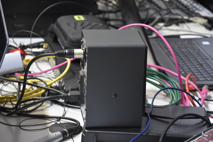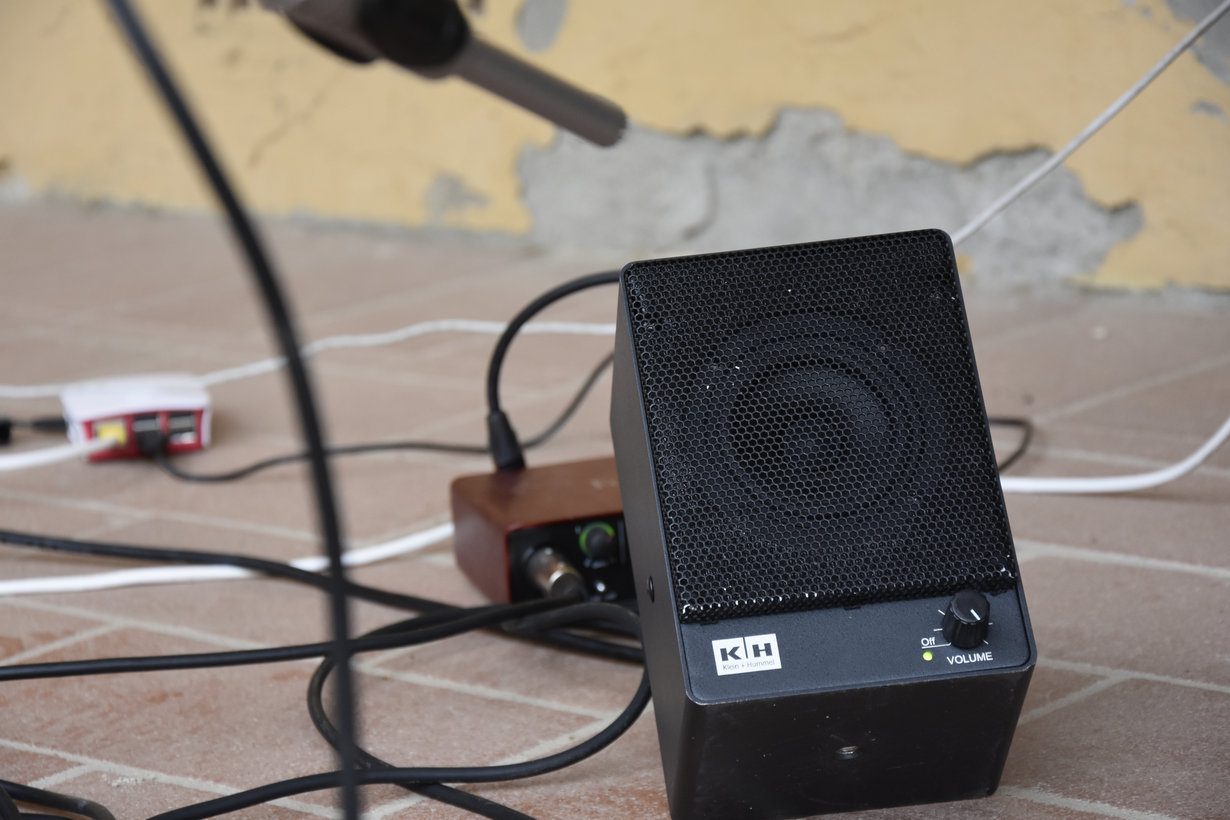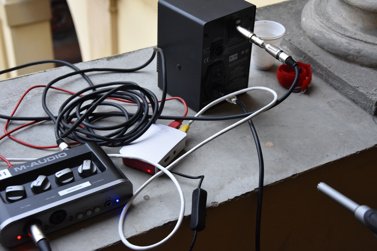 Each sound agent is composed of a raspberry pi 3 [1], an audio interface [2], a microphone [3] and a loudspeaker [4]. Through the latter, agents can be affected by (microphone) and affect (loudspeaker) all the other agents that compose the installation, thus creating an ecology of self regulating sound processes that generate complex sound forms out of a very reduced set of simple rules.