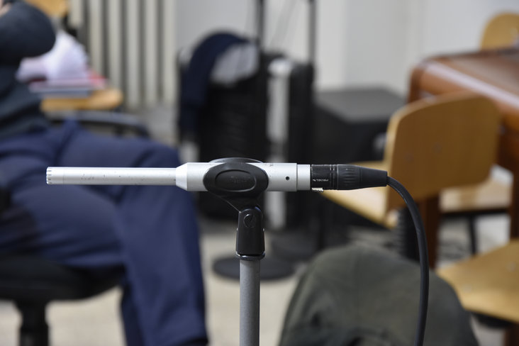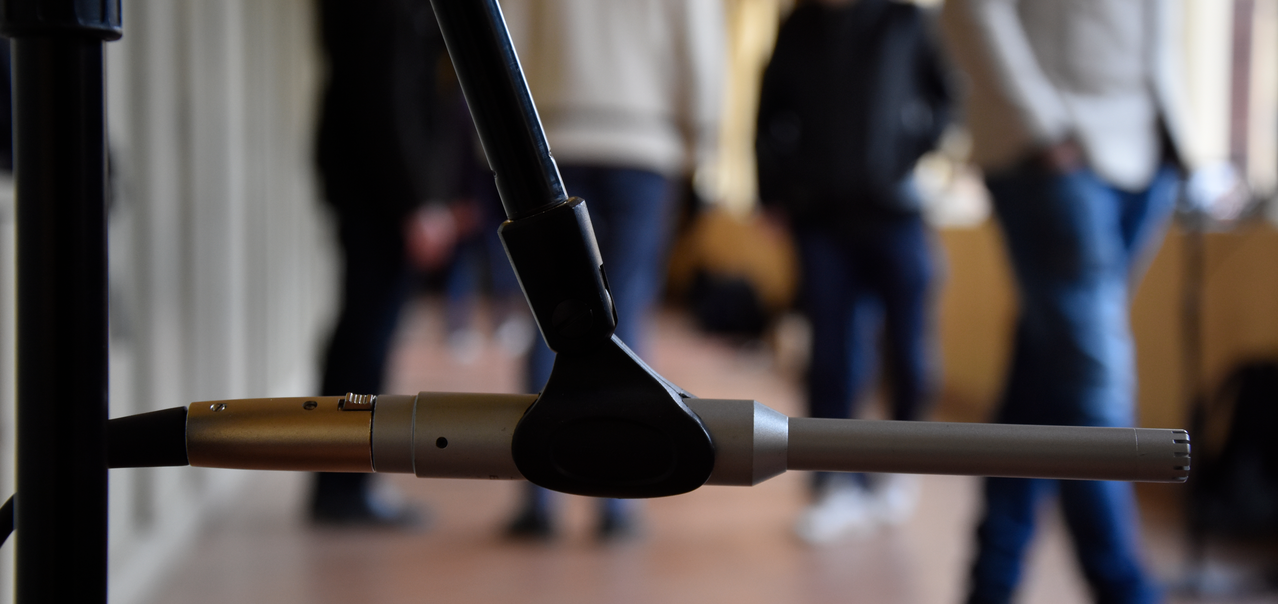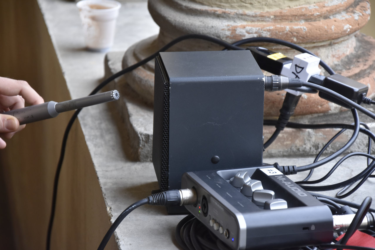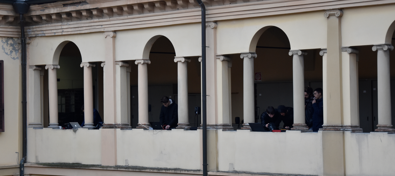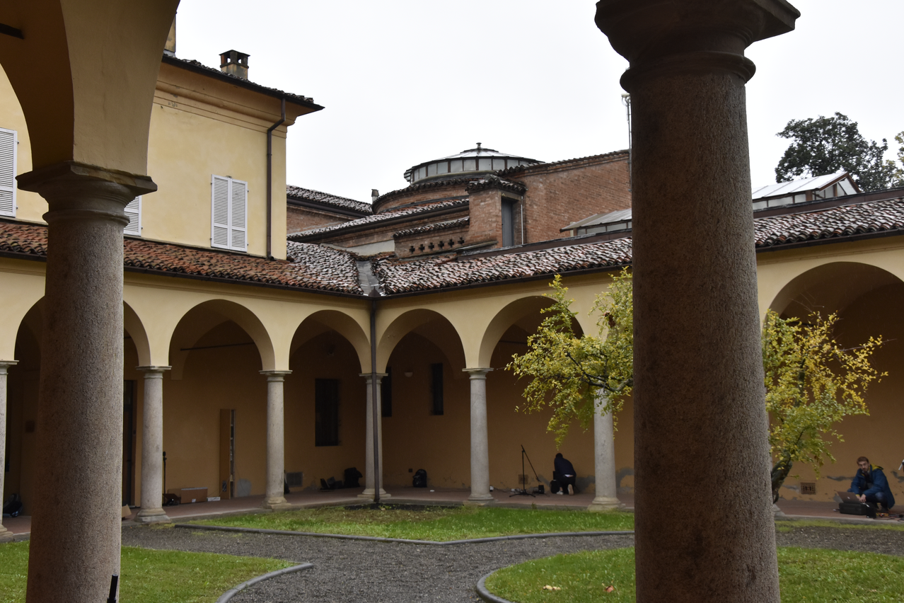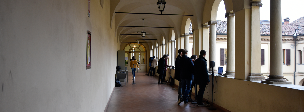 The Nicolini Conservatory is the music conservatory of Piacenza, located in the ancient Santa Franca monastery. It still retains the original cloister, with two covered walks running along the longitudinal side of the building. At the second floor, these correspond to two open arcade. The sound agents were disposed along these two arcades, at equal distance between each other (4 agents for each side of the building, with speakers facing the center, thus forming an ideal listening point in the cloister downstairs).