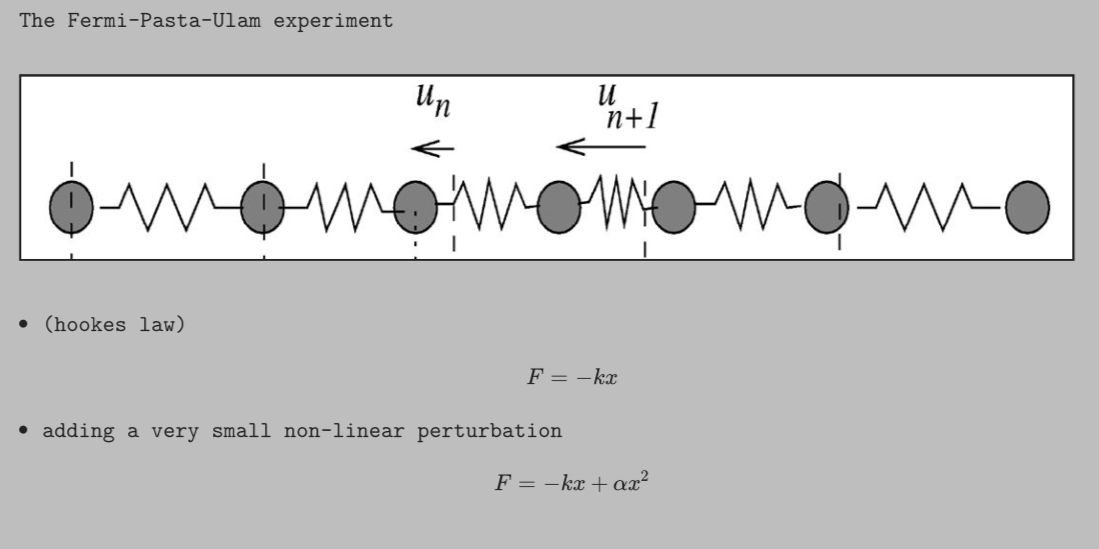 When algorithms and computers are approached as experimental machines, time becomes the space in which speculation and experimentation lives. The only possibility to study a speculative problem like the FPU expeirment is to simulate it. There are no analytical solutions to describe the system. The evolution of the system has to be computed, time step after time step in an approximated process called numerical integration.