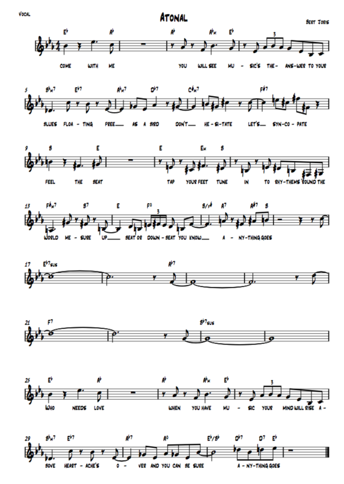 The aforementioned tune Atonal is a a variation of Rhythm changes, and an anagram of Anatol, an Italian name for the sequence. It's in Eb, then the second a is in B, from that key the logical first chord of the bridge is Eb7 just like the I got Rhythm bridge, going up a major third. Seem from the original key of Eb you could say it's the "Honeysuckle rose" Bridge, another very common traditional chord sequence used in the swing period for hundreds of tunes. Though it's very tonal, Bert likes to play around with the idea that it's atonal music, as you can hear in his Solo. Both the 2nd and the 3rd A section end with the chromtic ascending dominants found in "Seven steps to eaven" a tipical way to close a section, but note the difference in the rhythm. (The A7 in bar 15 being on the 2 and, and the Db7 chord in bar 31 being on the 3rd beat, giving the ending even more power and impact.)