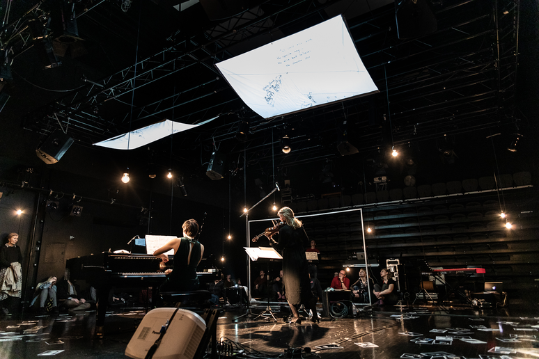 With non- or unstaging, on the other hand, I refer to forms of display that do not try to conceal the 'noise' of musical productions, that is, performances in which 'disturbing' elements are not made to silence or retreat. This can take various shapes, the most typical of them being acting on stage like in everyday life, both in terms of clothing, behaviour and relation to the audience. Ensemble Besides plays lounge music in the intervall between pieces and Ensemble neoN choreographs stage shifts, particularly lenghty and complex in contemporary music productions, thus highlighting the 'working' and technical aspects of the concert. In the productions of Impossible Situations, we make stage-inherent elements such as cables, mixers, scores or projectors 'extra visible' in our scenography to show how practical, technical and aesthetic elements entangle in the making of a concert; else we fill the stage with mirrors that give more visibility to small but significant visuals details of the music-making. We also invite our audiences to visit our set-up and to take part in open workshops (see Discourse). In Voyage au bout du piano, a contemporary piano event organized biannually at De Bijloke, scores of the pieces programmed that evening and other performance material were exhibited outside of the concert for audiences to listen and see in the intermissions. The material was shown in a space called 'clicktrack corner', in reference to the in-ear metronomes used by contemporary musicians to keep the beat and/or synchronise playing with video, electronics and tape. The clicktrack corner offered a rare insight into a phase of the performance normally concealed from the audience, as did Chloe Abbott's performance of Berio's trumpet Sequenza at the final concert of the seminar With and Beyond Music. Abbott had annotated the score beforehand, highlighting passages that she considered important and writing personal comments such as reminders and expression marks that could be understood both by musicians and lay persons. this information was shared with the audience through the scores projected behind her; a simple curatorial artifice that produced very personal results. Unstaging might also mean purposefully subverting ritual markers, as in MusicExperiment21's Rasch, which starts before the audience enters the hall and finishes after musicians have left the stage, thus avoidig the final applause. While the audience tends to react positively to the immersive sensation caused by entering an ongoing performance, the absence of applause elicits mixed reactions, most likely due to the listeners not always knowing how and where to channel the energy, enthusiasm or frustration provoked by the performance.