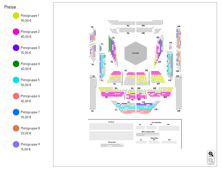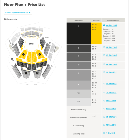 The Berliner Philharmonic in Berlin is a precursor and model to this symbolic understanding of the classical concert hall. Built in 1963 in the heart of a town split between opposed political regimes, it was conceived as a democratic listening arena symbolising the Western approach to culture. Architecture critic Nicolai Ourossoff writes about it: ‘Scharoun’s masterpiece, erected alongside the barbed-wire and concrete barriers of the Berlin Wall, was an aggressive attempt to tear down the traditional social hierarchies of the classical music world. Gone were the grand stairs, classical colonnades or golden interiors. Instead he planted the concrete bowl of his main performance space on canted columns, so that the underbelly of the hall became an extension of the street life outside. Draped over this interior, the strange yellow, tent-like skin was a joyfully democratic expression of the hall’s public character and a landmark of communal solace in a divided city.’ However, if we compare the democratic utopia attributed to Sharoun and current prices of concert tickets, we see that universal accessibility remains a slogan and a beautiful intention. Upon closer observation (see floor plan), it might even be said that surround halls like the Berliner Philharmonic allows for even more differences in pricing categories.