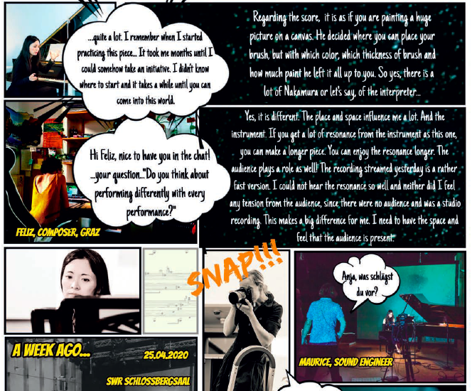 During the current corona-pandemic, it is becoming more and more usual to invite the audience for a moderated talk or informal chat after the concert is streamed, via Zoom or other online platform. Pianist Rei Nakamura did so after a concert streamed by the WDR at the Acht Brücken Festival. Nakamura created a comic strip recalling the process of preparing and performing a digital concert, and of discussing the works and the interpretation with the audience afterwards. The comic strip, published in the German music magasine Musiktexte, was a humorous but informative way to get insight into the performer's universe but also into the challenges of a performer dealing with new forms of musical presentation.